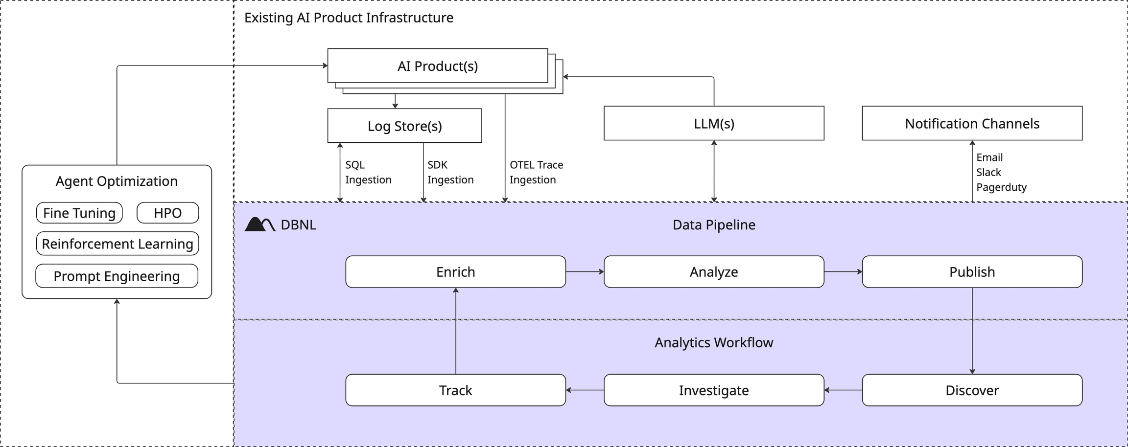 DBNL integrates with your existing AI tools to easily and securely perform analytics for any AI product. The DBNL Data Pipeline ingests, enriches, and analyzes production AI logs and traces, surfacing behavioral signals. These signals are published to Dashboards and as Insights, allowing users to discover, investigate, and track them as part of the DBNL Analytics Workflow. This gives you concrete signals and relevant data to power improvements to your agent as part of an AI data flywheel.