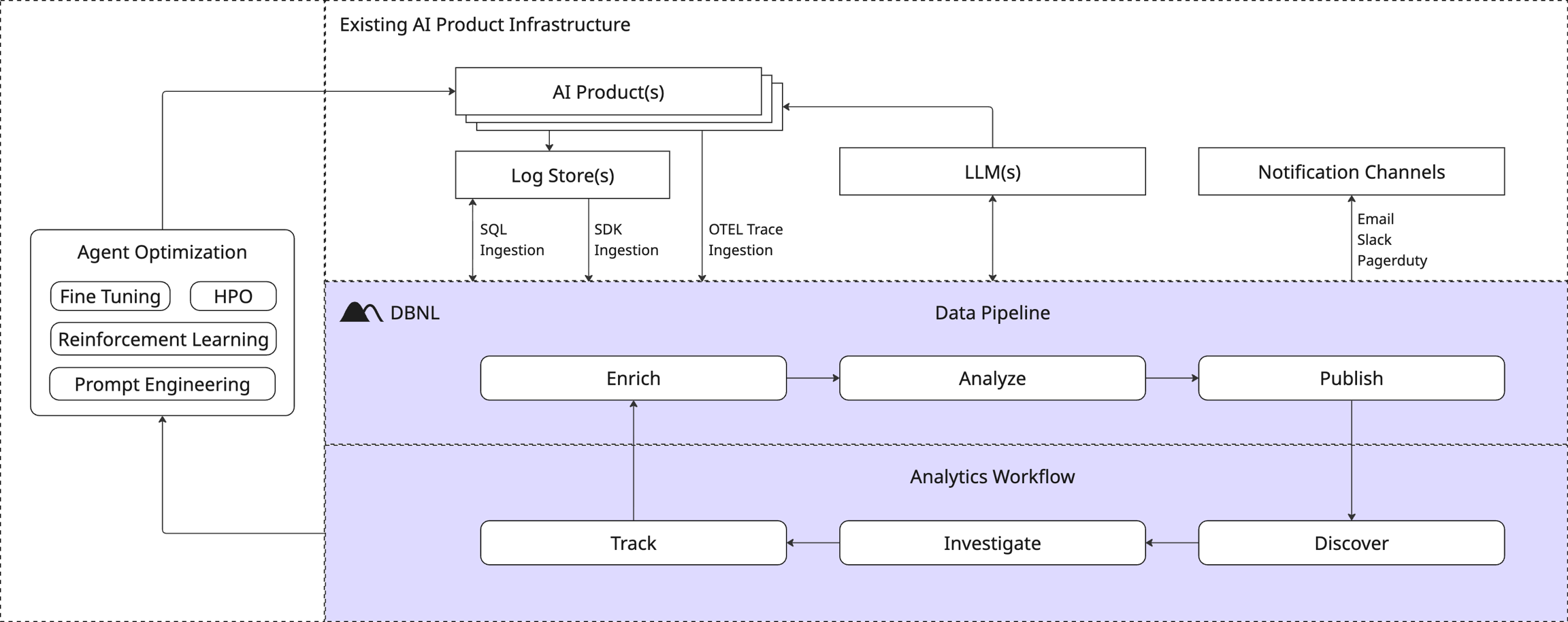 DBNL integrates with your existing AI tools to easily and securely perform analytics for any AI product. The DBNL Data Pipeline ingests, enriches, and analyzes production AI logs and traces, surfacing behavioral signals. These signals are published to Dashboards and as Insights, allowing users to discover, investigate, and track them as part of the DBNL Analytics Workflow. This gives you concrete signals and relevant data to power improvements to your agent as part of an AI data flywheel.