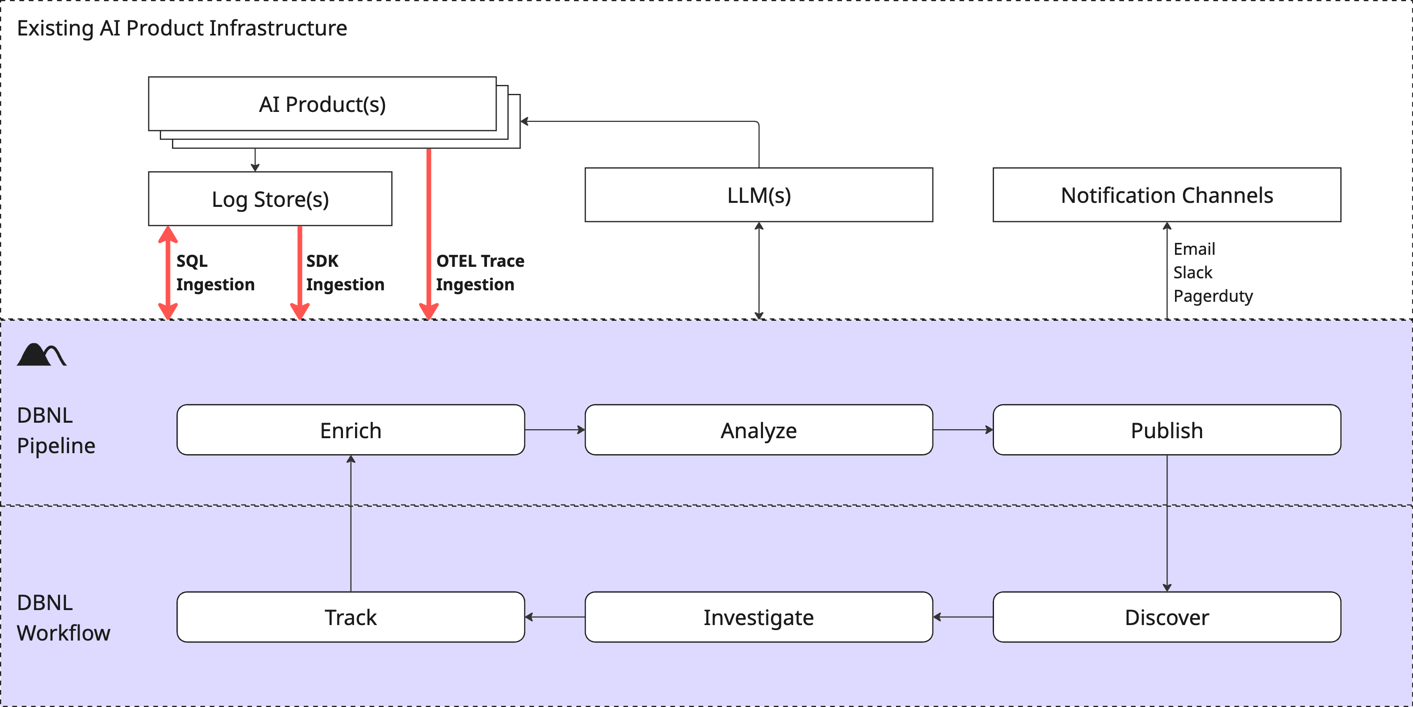<figure><img src="https://content.gitbook.com/content/yx9NXaWRjaOtW8ILLJQO/blobs/RJydpsrfdmJyDlYH1Bgl/DBNL-data-connections.png" alt=""><figcaption><p>Data Connections are how Production AI log data is ingested into DBNL, kicking off the <a href="../workflow/adaptive-analytics-workflow">Analytics Workflow</a>.</p></figcaption></figure>