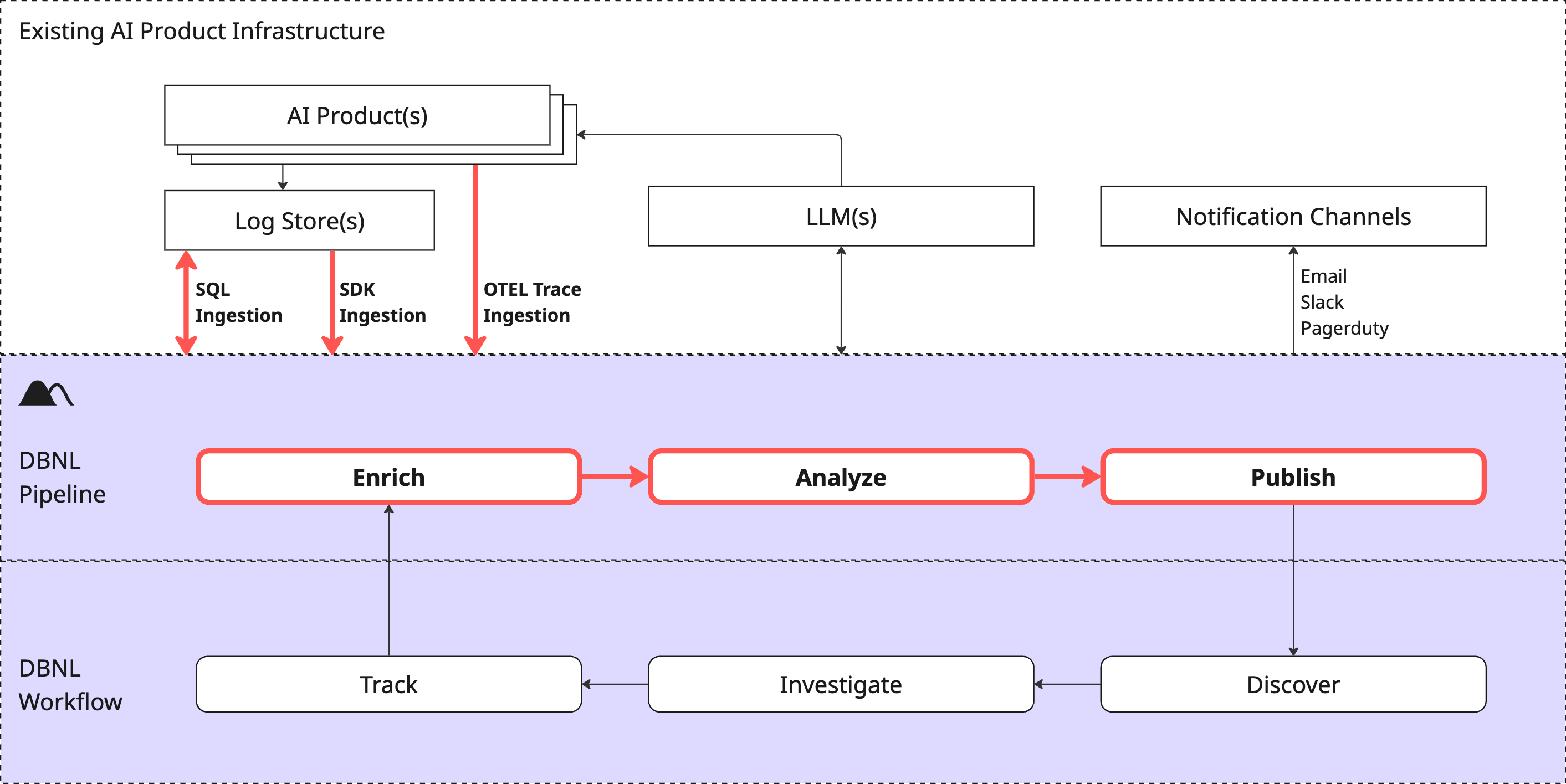 The Data Pipeline is invoked as production log data is ingested into your DBNL [Deployment](https://docs.dbnl.com/platform/deployment). This process kicks off at data ingestion if using [SDK Log Ingestion](https://docs.dbnl.com/configuration/data-connections/sdk-log-ingestion) and daily at UTC midnight for [OTEL Trace Ingestion](https://docs.dbnl.com/configuration/data-connections/otel-trace-ingestion).
