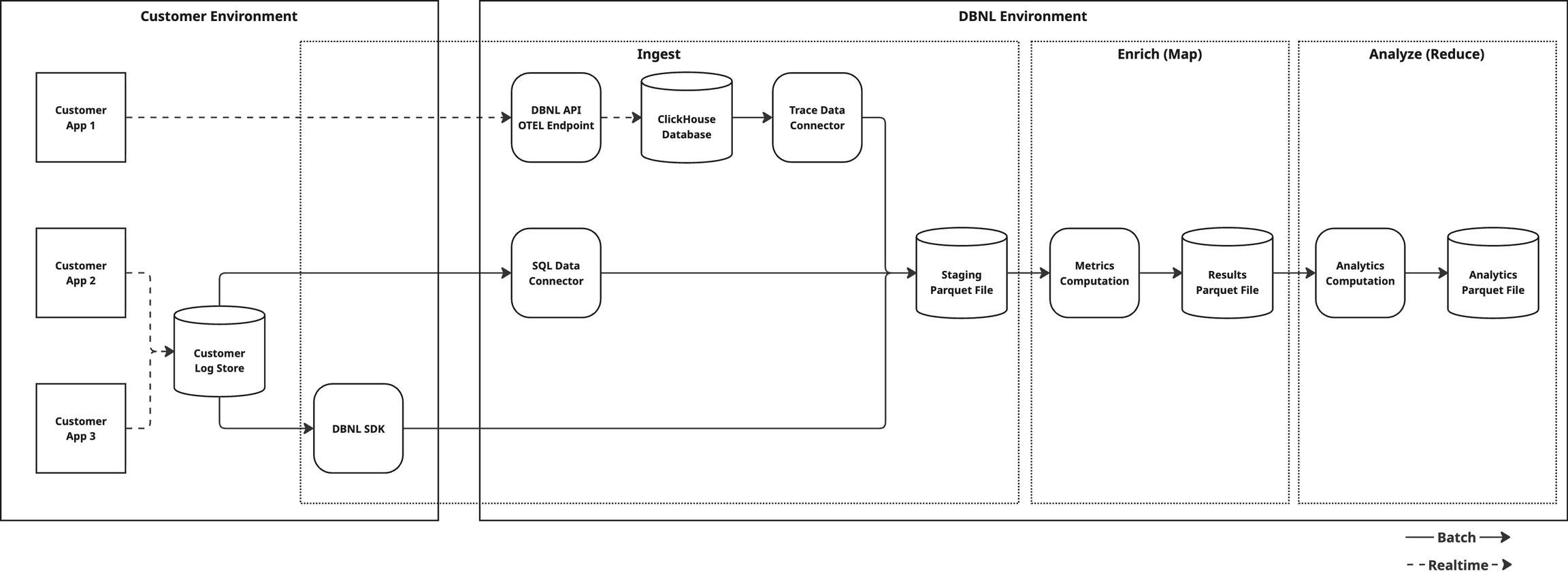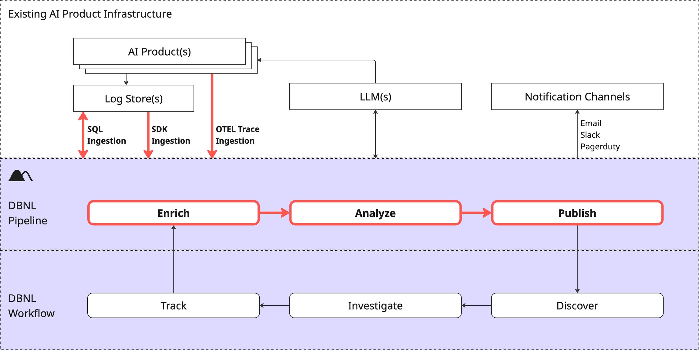 The Data Pipeline is how DBNL converts raw production AI log data into actionable Insights and Dashboards for each Project and stores it for future analysis within the Data Model.
