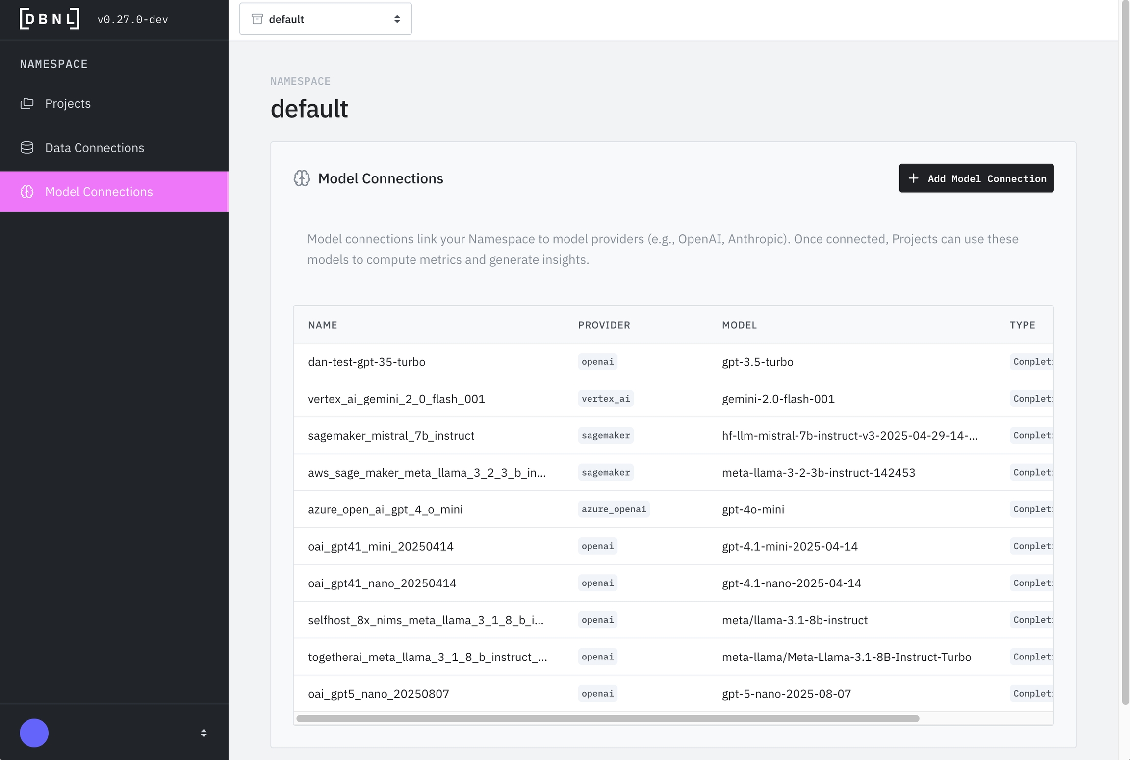 Model Connections are how DBNL interfaces with LLMs, which is required for each step of the DBNL Data Pipeline to function. It enables DBNL to