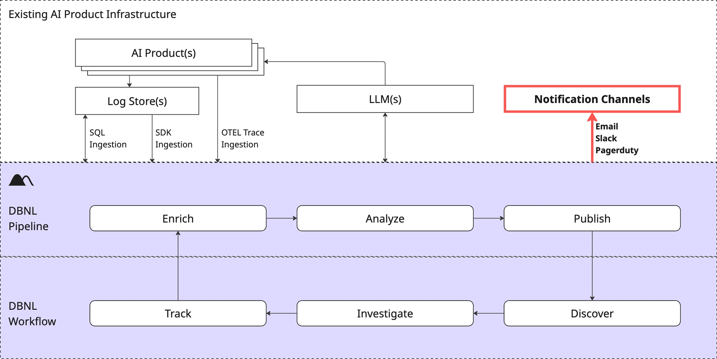 Supported notification channels include Email, Slack, and Pagerduty with more coming soon.