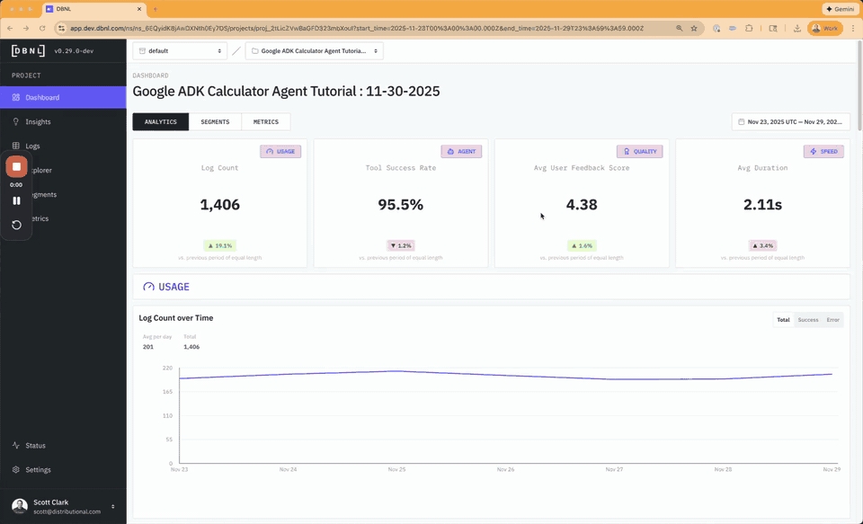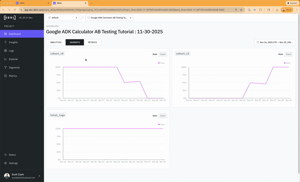 The A/B Testing Tutorial demonstrates how to compare agent versions: