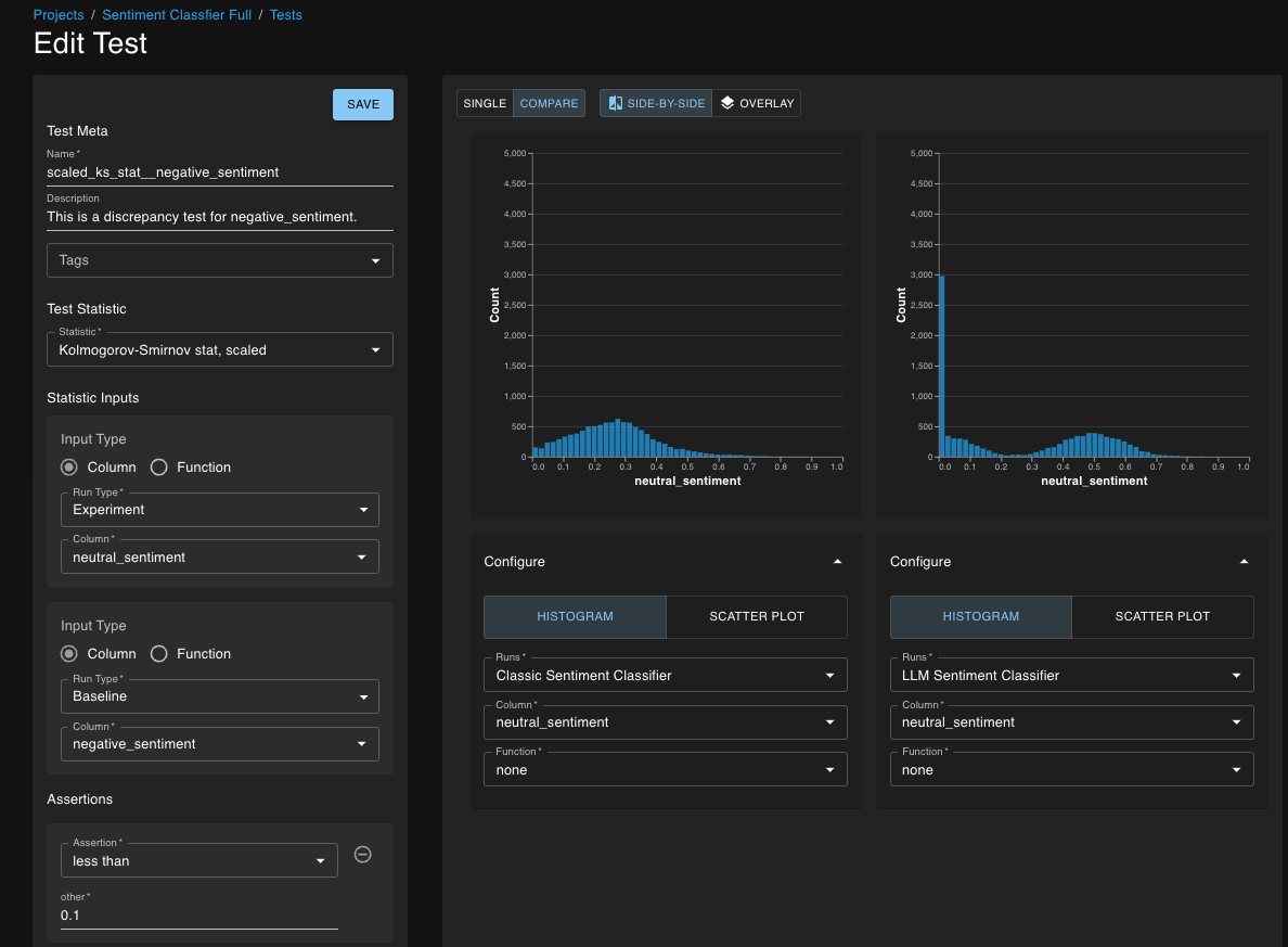 This is an example test on the `neutral_sentiment` column. The test asserts that the distribution of the `neutral_sentiment` column in the new model is similar to the distribution of the `neutral_sentiment` column in the original model.