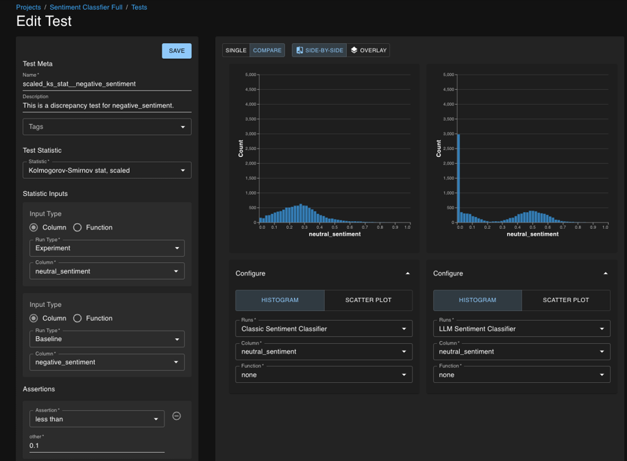 This is an example test on the neutral_sentiment column. The test asserts that the distribution of the neutral_sentiment column in the new model is similar to the distribution of the neutral_sentiment column in the original model.