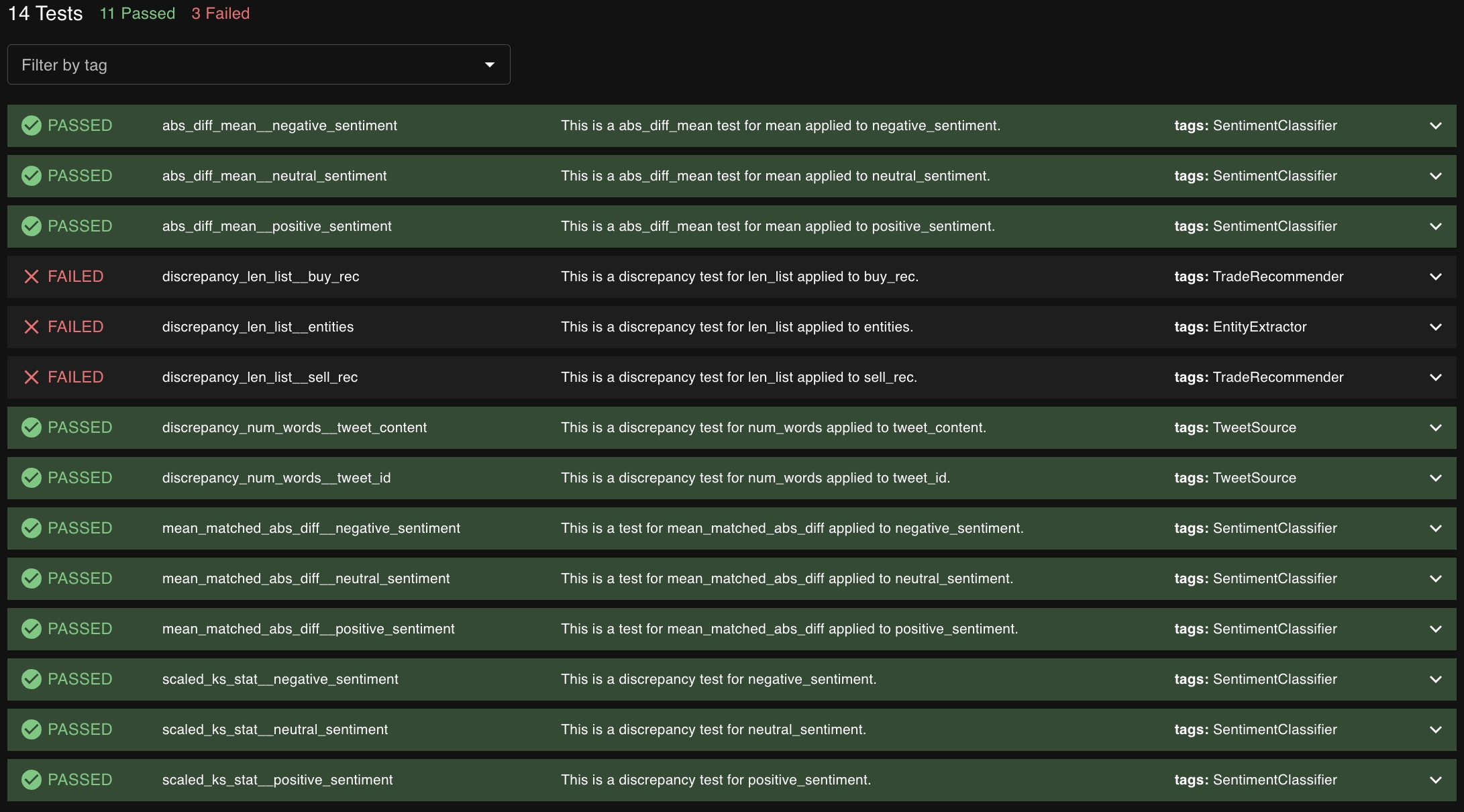 Once you have data in Distributional, you can conduct continuous integration testing by creating tests which define consistent behavior between the current status of the app and the baseline as defined earlier.