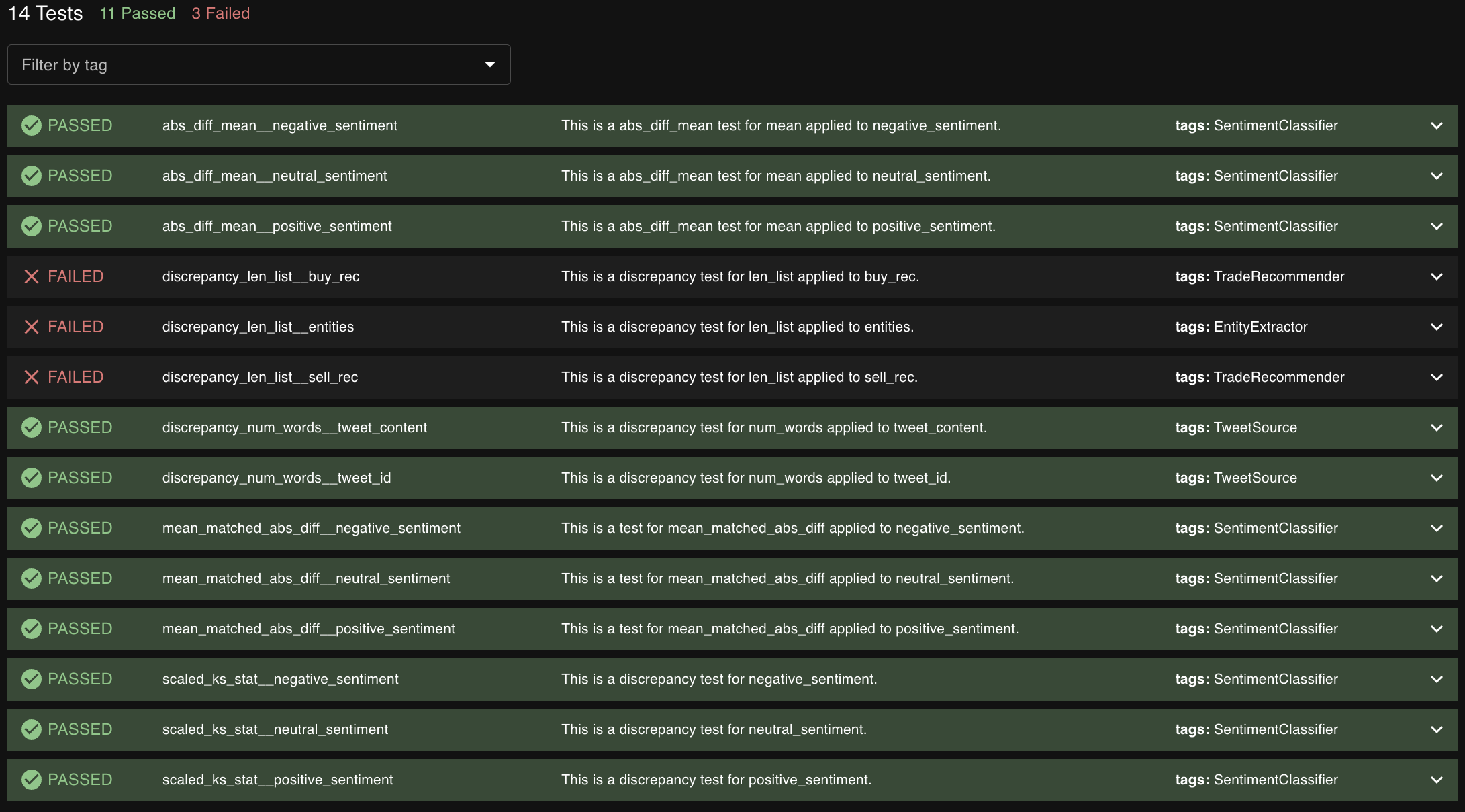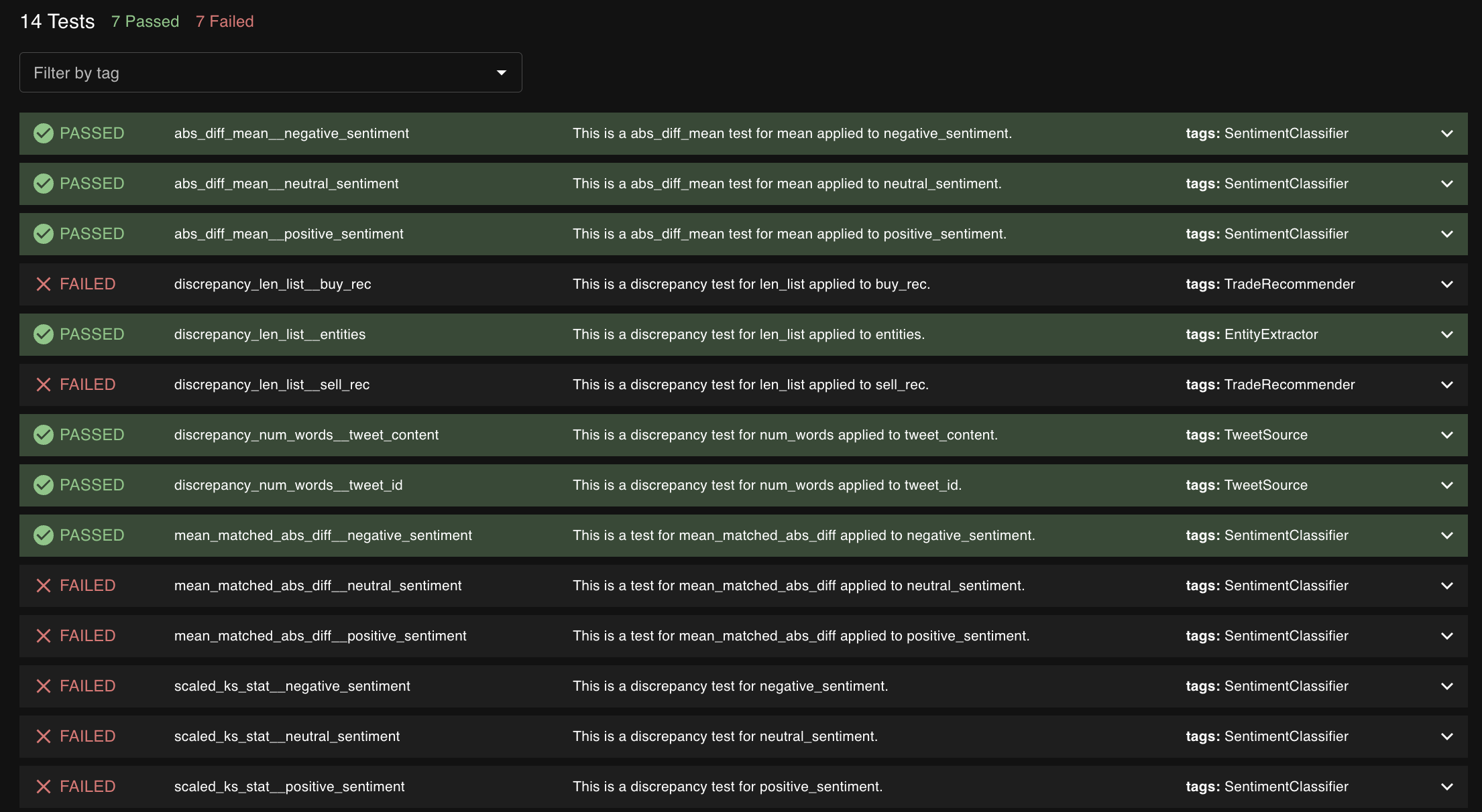 <figure><img src="https://content.gitbook.com/content/z6EklLimWg9qh5eYpLkw/blobs/07guwTD9WP4vbrJBSKf0/image.png" alt=""><figcaption><p>A test session with failures that were likely caused by the sentiment classifier.</p></figcaption></figure>