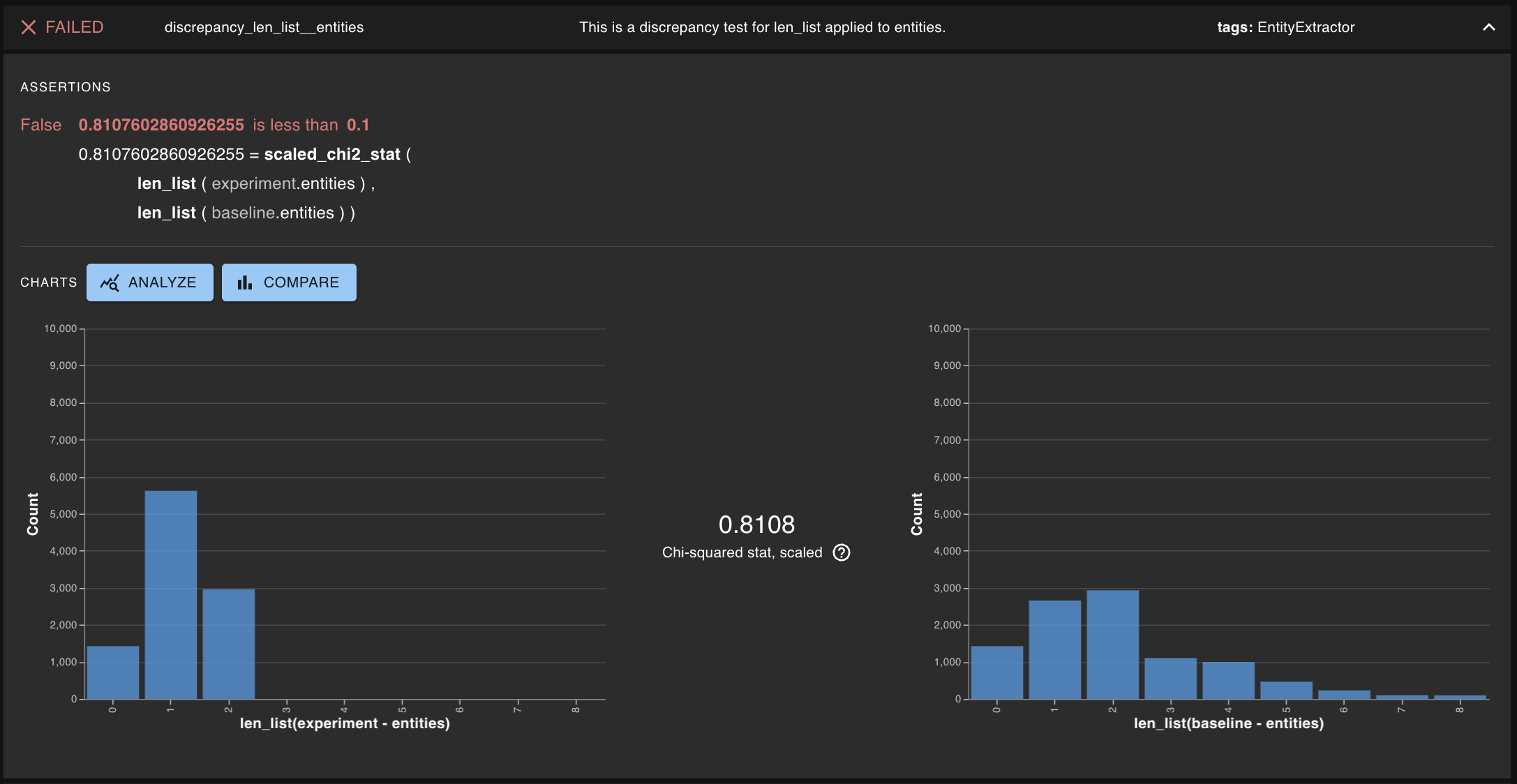We write tests on the consistency of the distribution of the number of entities extracted. These return a scaled version of the chi-squared statistic. Similarly, we set a threshold about how large this statistic can be before we consider the test to have failed. These tests are all being compared to the corresponding distribution of the baseline run.