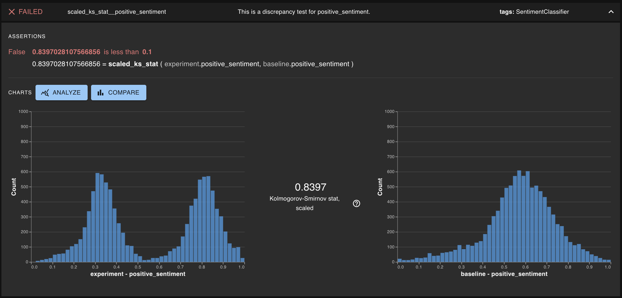 Within this test session, we can expand out one of the failed assertions.  In the image below, we can see some severely different behavior in sentiment -- well beyond the threshold for this KS test.  Given that the TweetSource tests passed, we know that the data has not changed.  To learn what behavior is changing in the `SentimentClassifier` we can visit the Compare page which is linked.