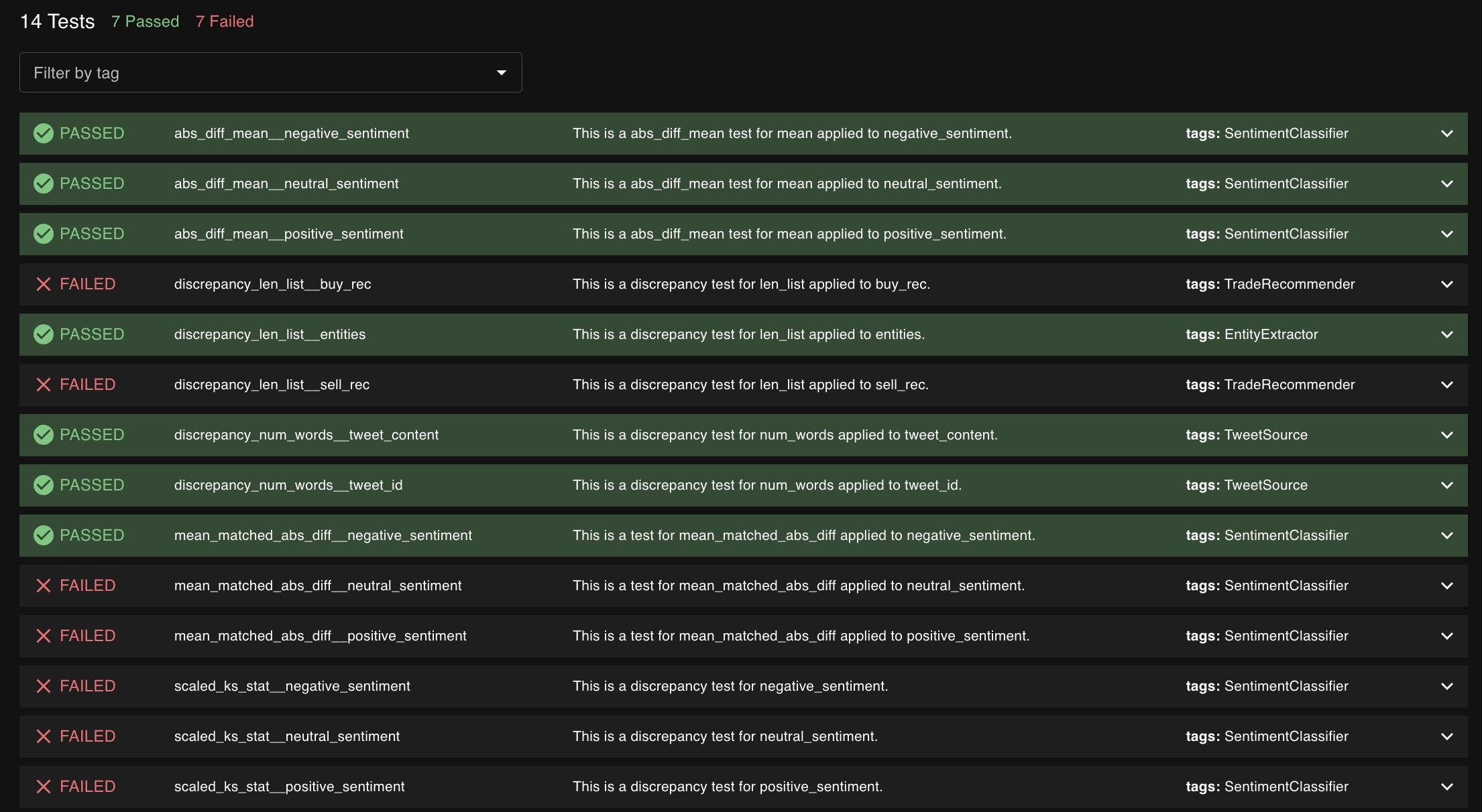 Once you have data in Distributional, you can conduct continuous integration testing by creating tests which define consistent behavior between the current status of the app and the baseline as defined earlier.