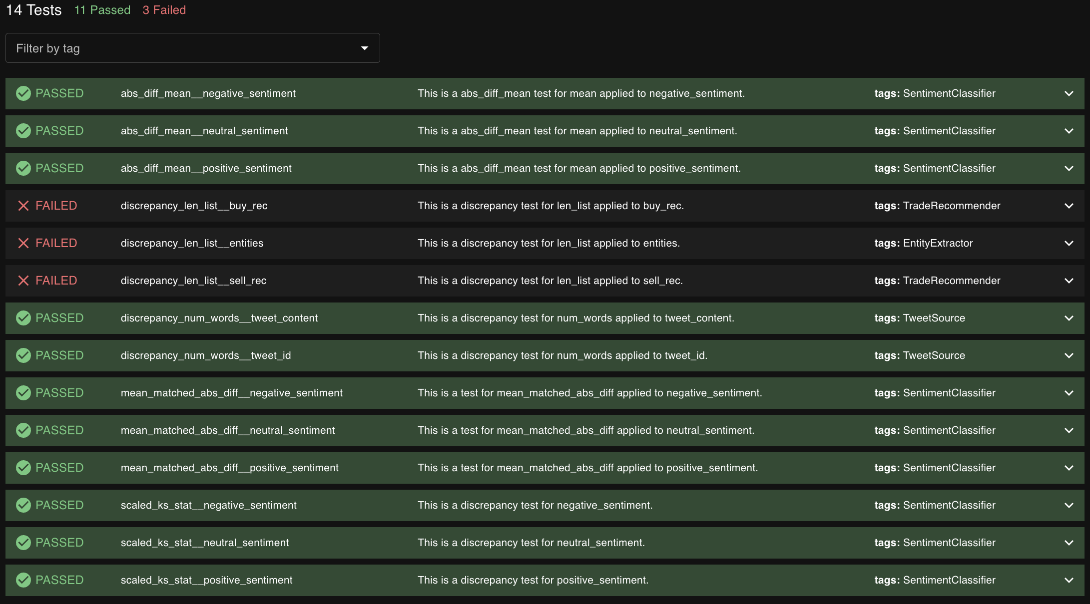 Here, the TradeRecommender tests are again failing, but this time the EntityExtractor test is failing and the SentimentClassifier tests are all passing (as are the TweetSource tests). This breadth of testing across all components allows us to believe that the EntityExtractor is the most likely source of problems because it is upstream of TradeRecommender.