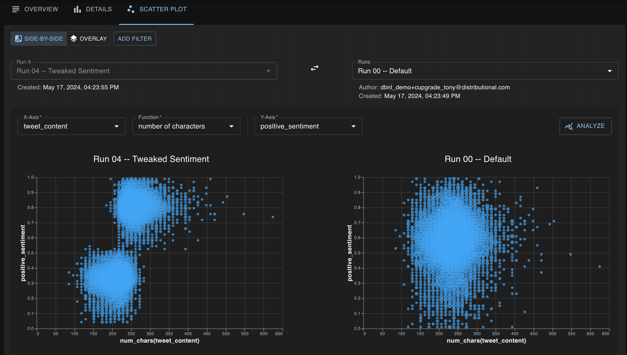 From the Compare page, we can try to learn how the columns of the run may yield insights as to why we are seeing such aberrant app behavior. In particular, we can use the raw text present in the tweet_content to conduct analysis on properties that DBNL can derive (including the length of the tweet). The graph below shows some, perhaps, bizarre change in behavior, where long tweets are seen very positively and short tweets are seen very negatively.