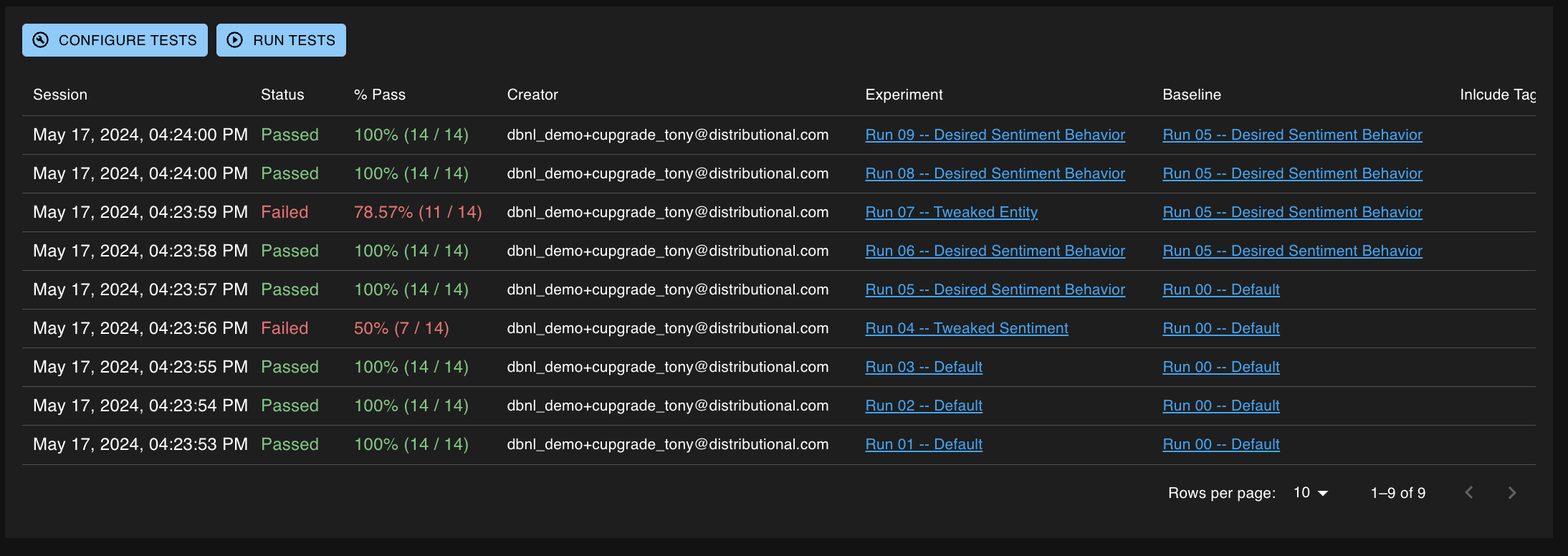 This tutorial provides 10 total runs reflecting the continuous testing of the asset trading strategy described above. You can use the code provided to submit these in chronological order, or your dedicated DBNL customer engineer can have these automatically loaded into your account. After that has taken place, if the baseline has been appropriately set, your test sessions will be automatically populated.