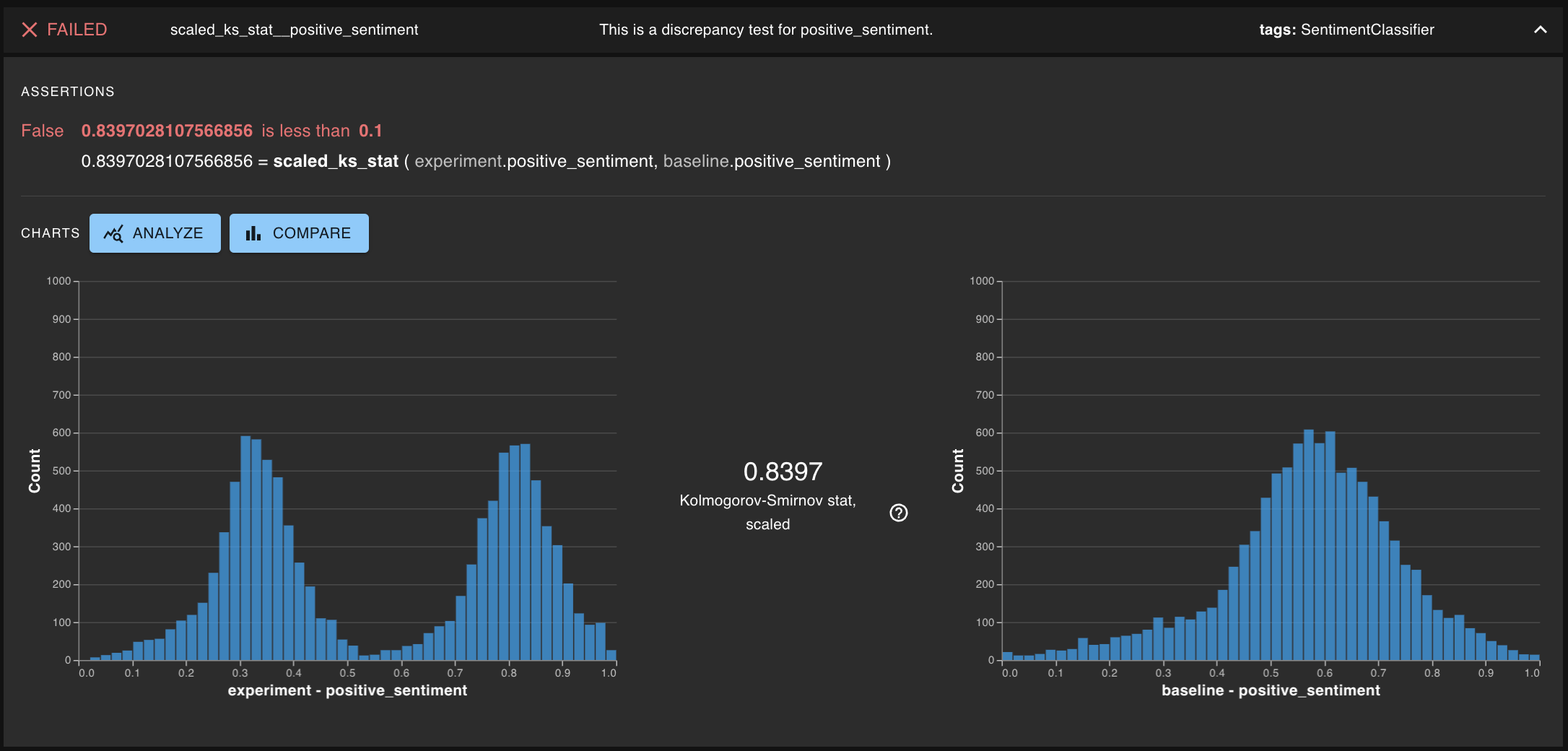 Within this test session, we can expand out one of the failed assertions. In the image below, we can see some severely different behavior in sentiment -- well beyond the threshold for this KS test. Given that the TweetSource tests passed, we know that the data has not changed. To learn what behavior is changing in the SentimentClassifier we can visit the Compare page which is linked.