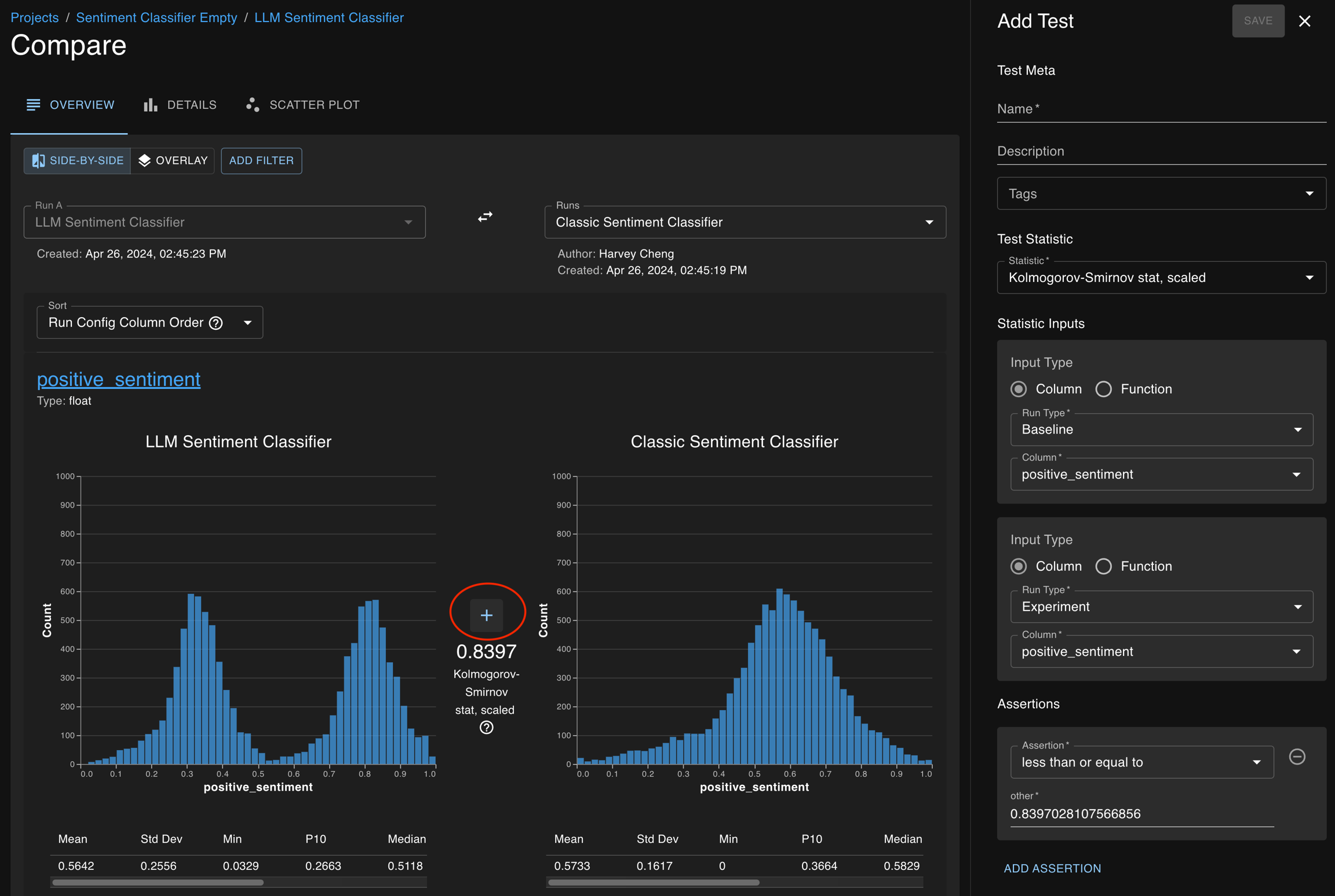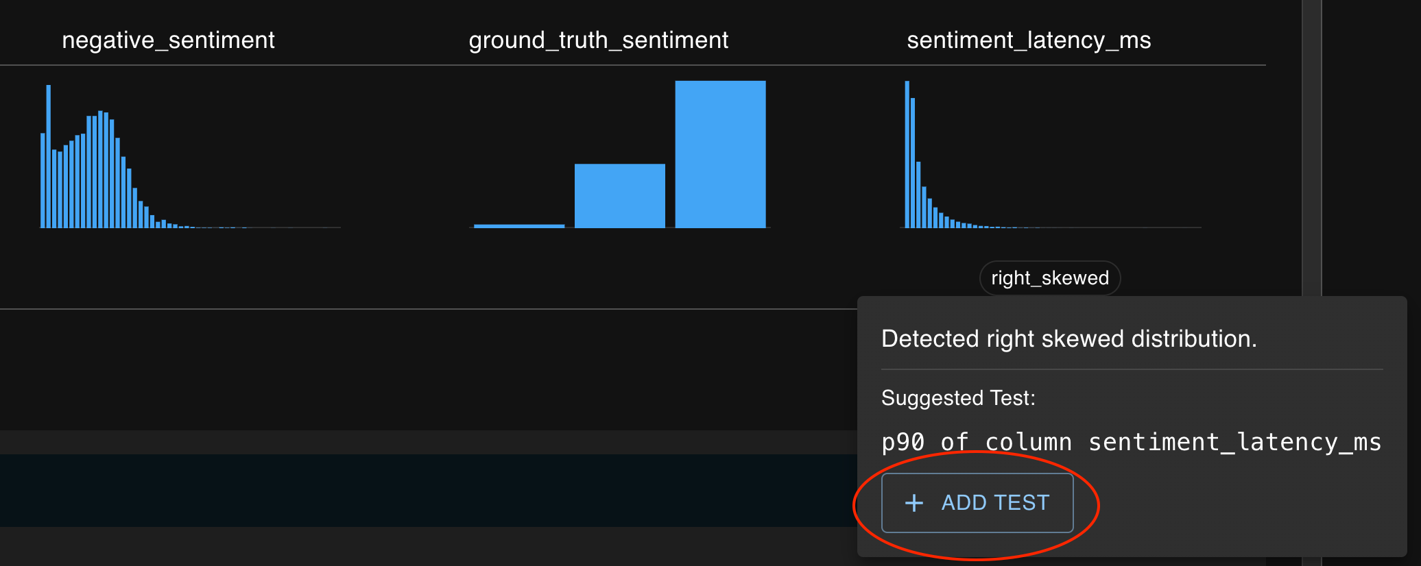 Here, each entry in the summary statistics table (on the Run Detail page) can be used to seed creation of a test for that chosen statistic.