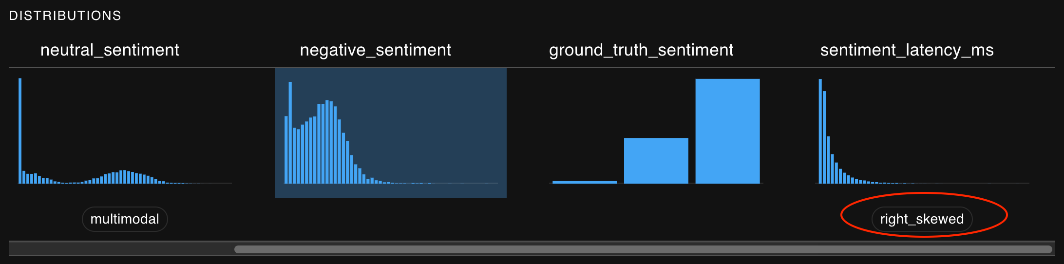If an interesting statistical property is present for a given distribution, you may be alerted to that fact above the mini charts on the Run Detail page.