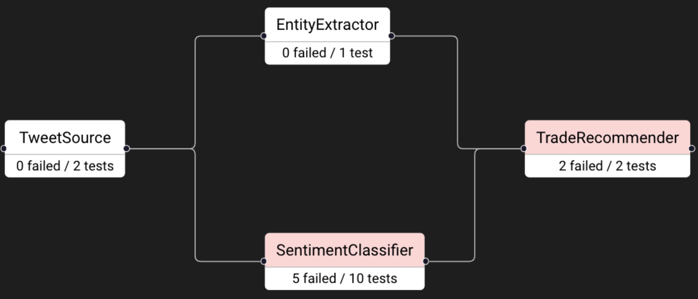 Tests were created to confirm the satisfactory behavior of the app. We can see that the TradeRecommender seems to be misbehaving, but so is the SentimentClassifier. Because the SentimentClassifier appears earlier in the DAG, we start our triage of these failed tests there.
