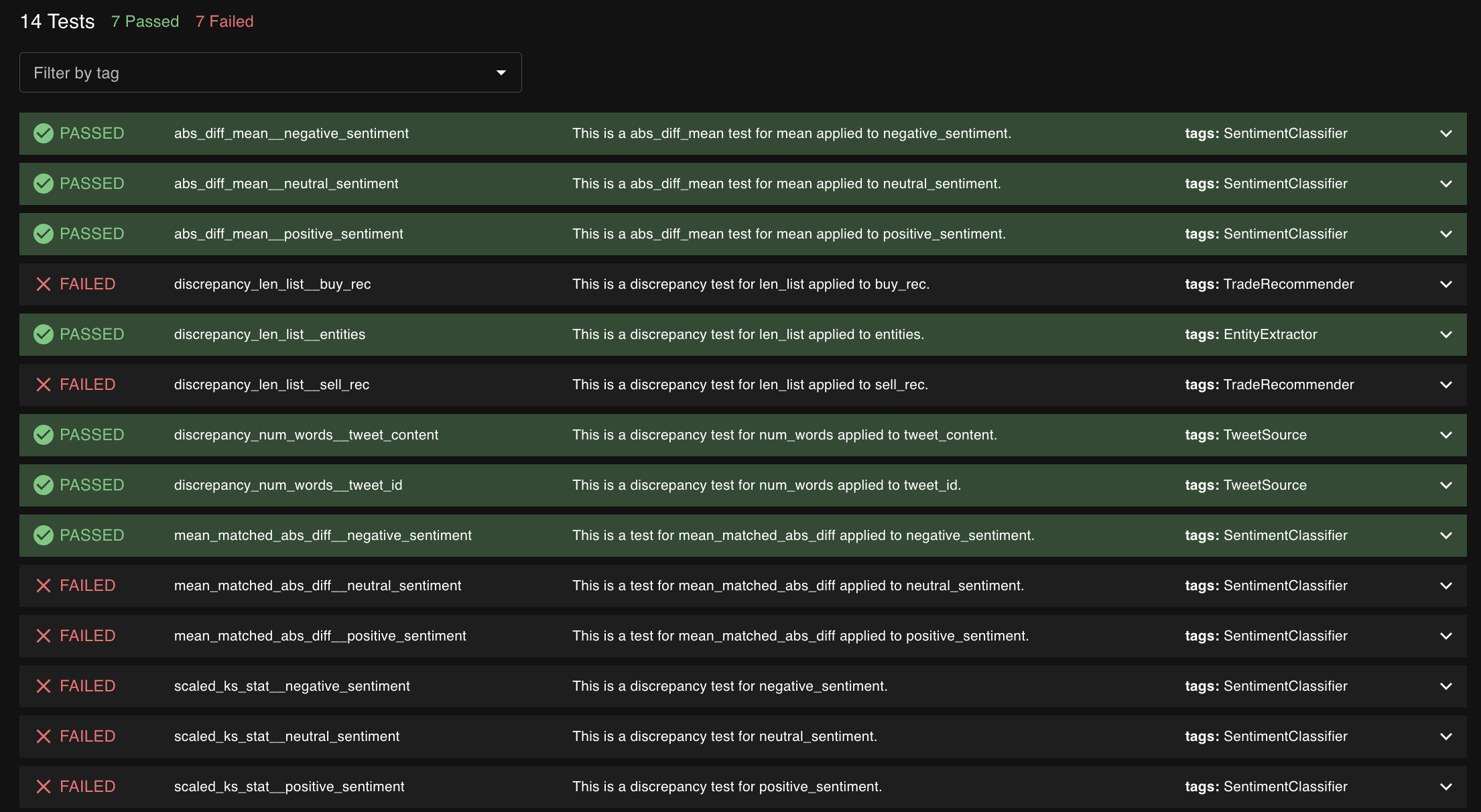 Here, the TradeRecommender tests are again failing, but this time the EntityExtractor test is failing and the SentimentClassifier tests are all passing (as are the TweetSource tests). This breadth of testing across all components allows us to believe that the EntityExtractor is the most likely source of problems because it is upstream of TradeRecommender.