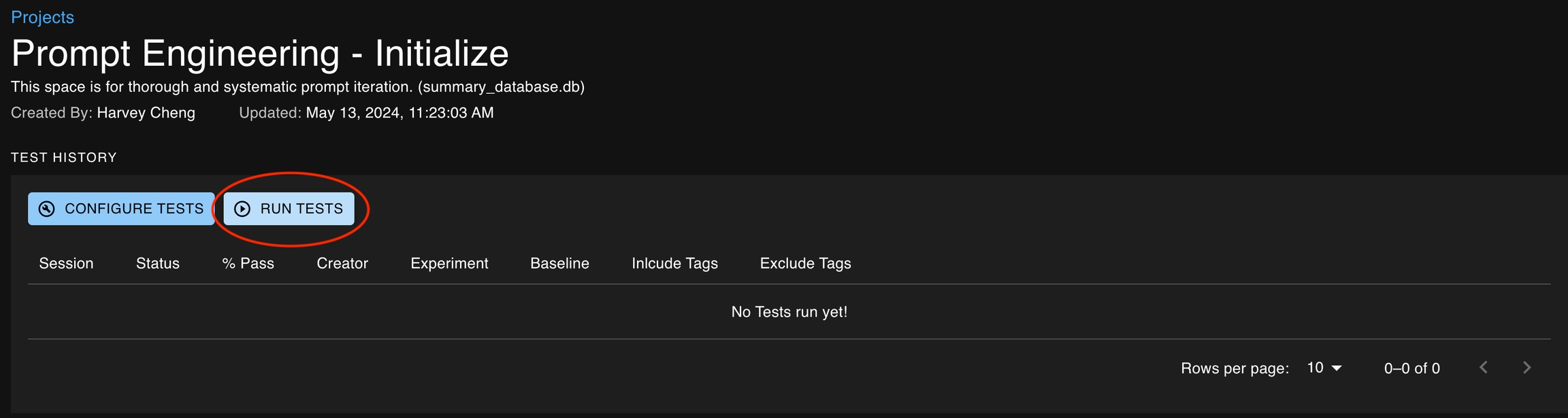 You can choose to run tests associated with a project by clicking on the Run Tests button on the project details page. This button will open up a modal that allows you to specify the baseline and experiment runs as well as the tags of the tests you would like to include or exclude from the test session.