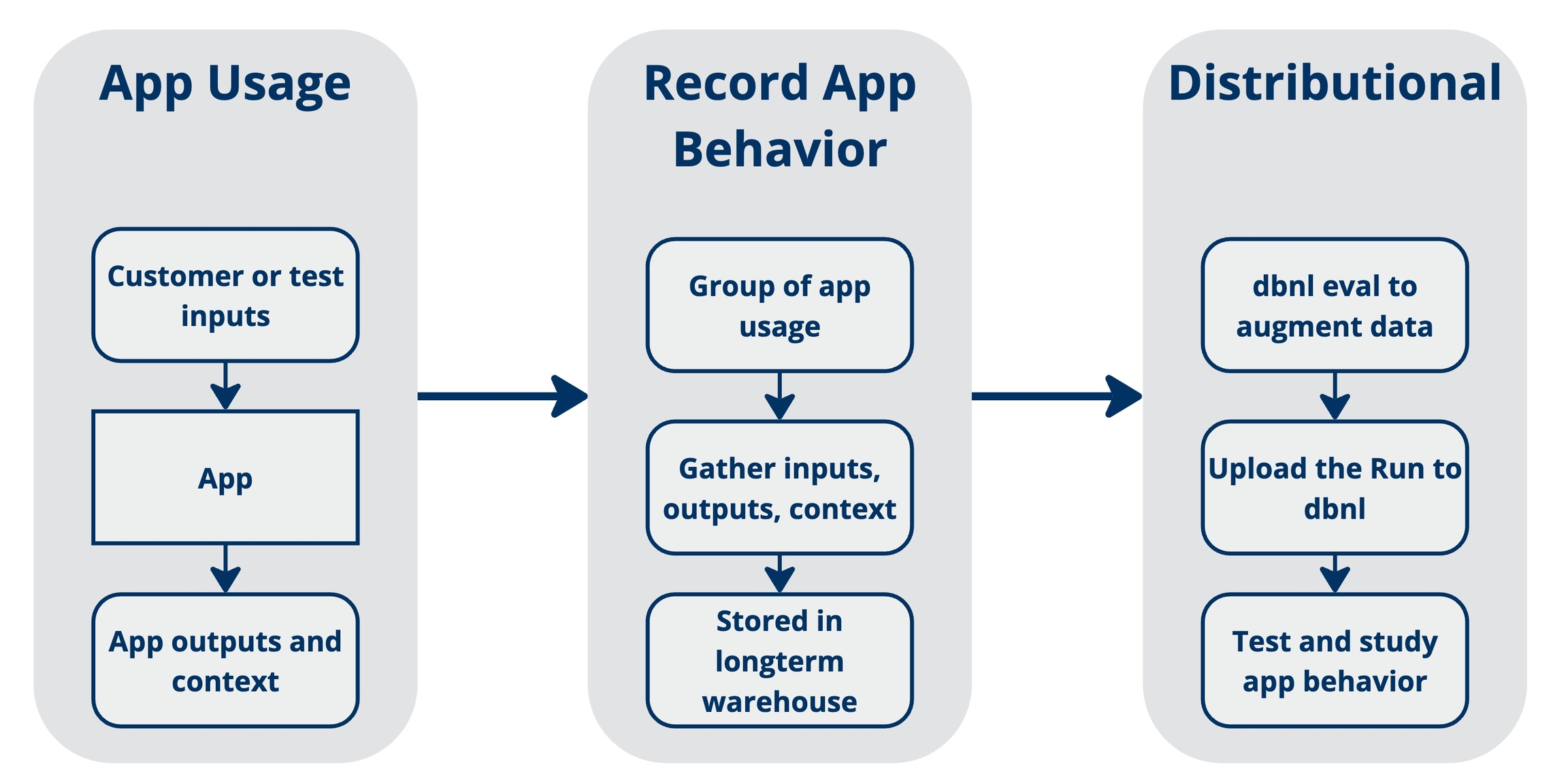 Distributional uses data generated by your AI-powered app to study its behavior and alert you to valuable insights or worrisome trends. The diagram below gives a quick summary of this process: