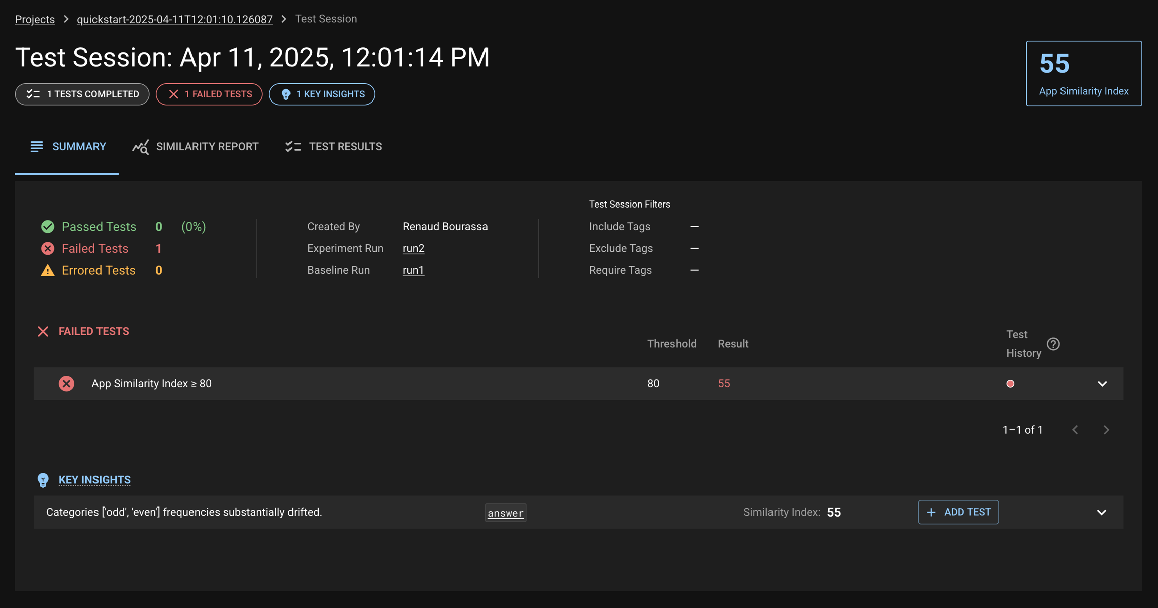 By default, a Similarity Index test is added that tests whether your application has changed between the Baseline and Experiment Run.