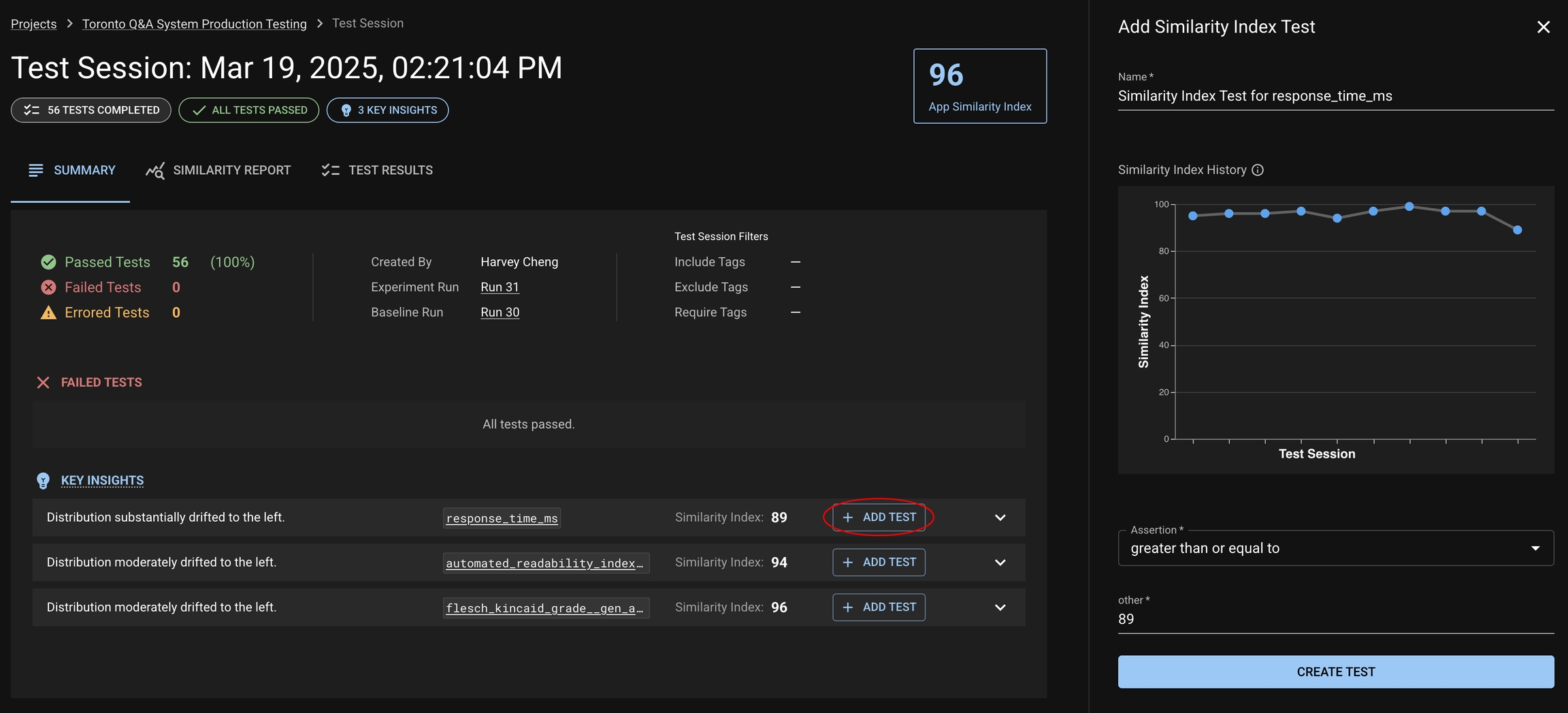 When you're looking at a Test Session, DBNL will provide insights about which columns or metrics have have demonstrated the most drift. These are great candidates to define tests on if you want to be specificially alerted about their behavior. You can click the "Add Test" button to create a test on the Similarity Index of the relevant column. The Similarity Index history graph can help guide you on choosing a threshold.