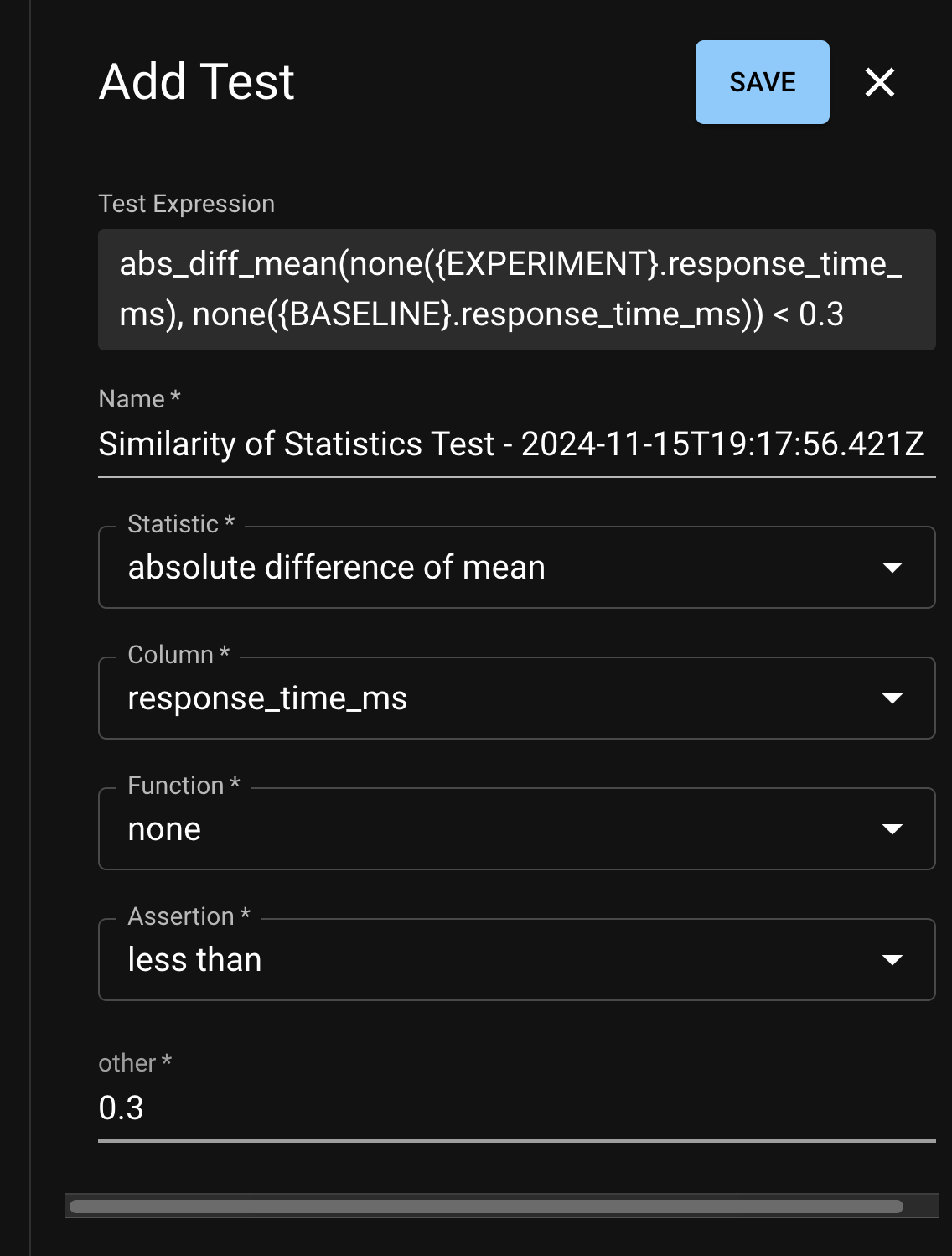 Similarity of Statistics: These test if the absolute difference of a statistic of a column between two runs is less than a threshold.
