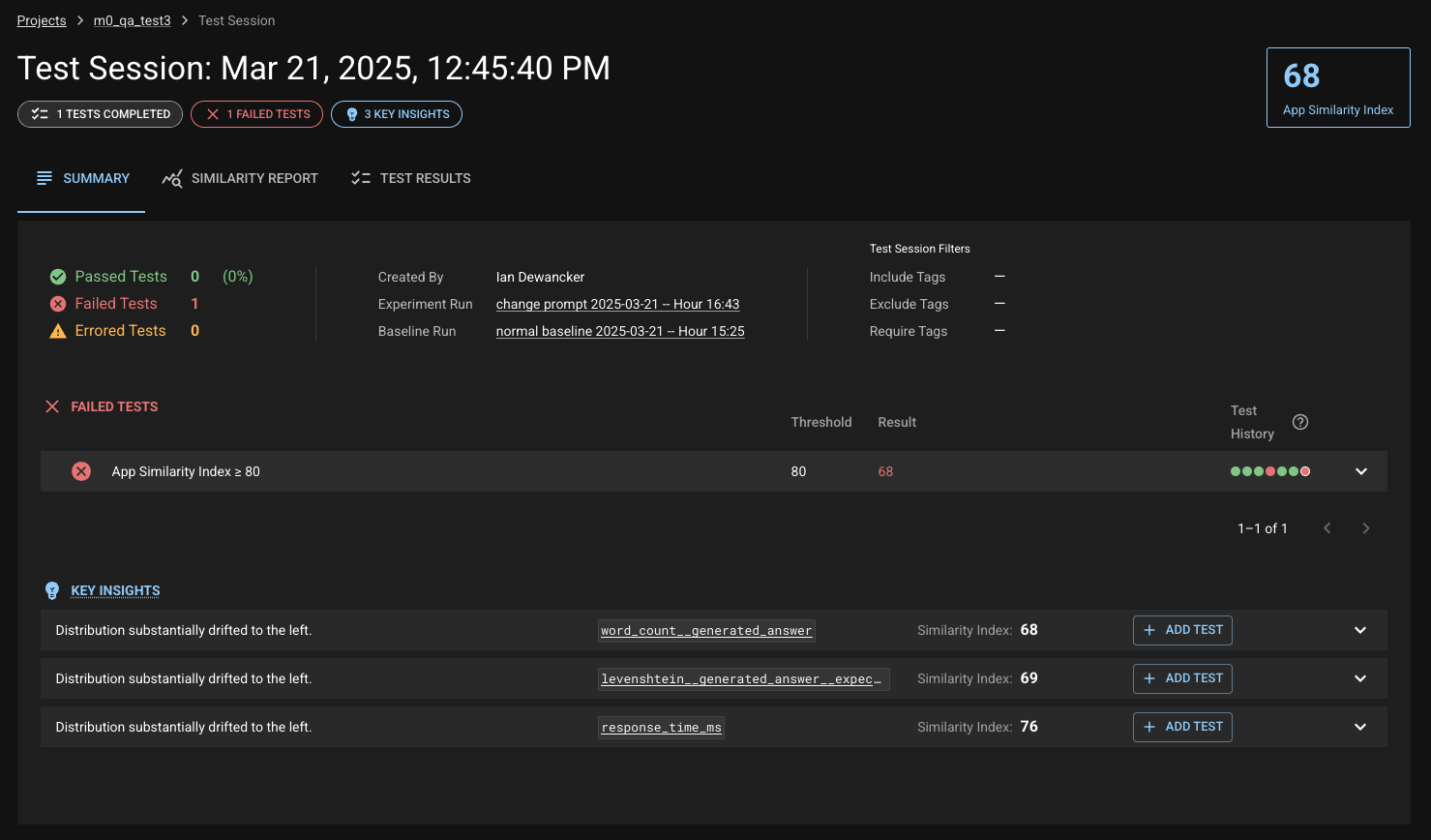 On the Summary tab, you'll notice a list of insights that DBNL has discovered about your Test Session. The key insights will tell you at a glance which columns or metrics have had the most significant change in your Experiment Run when compared to the baseline. If you are particularly interested in the column or metric going forward, you can quickly add a test for its Similarity Index.