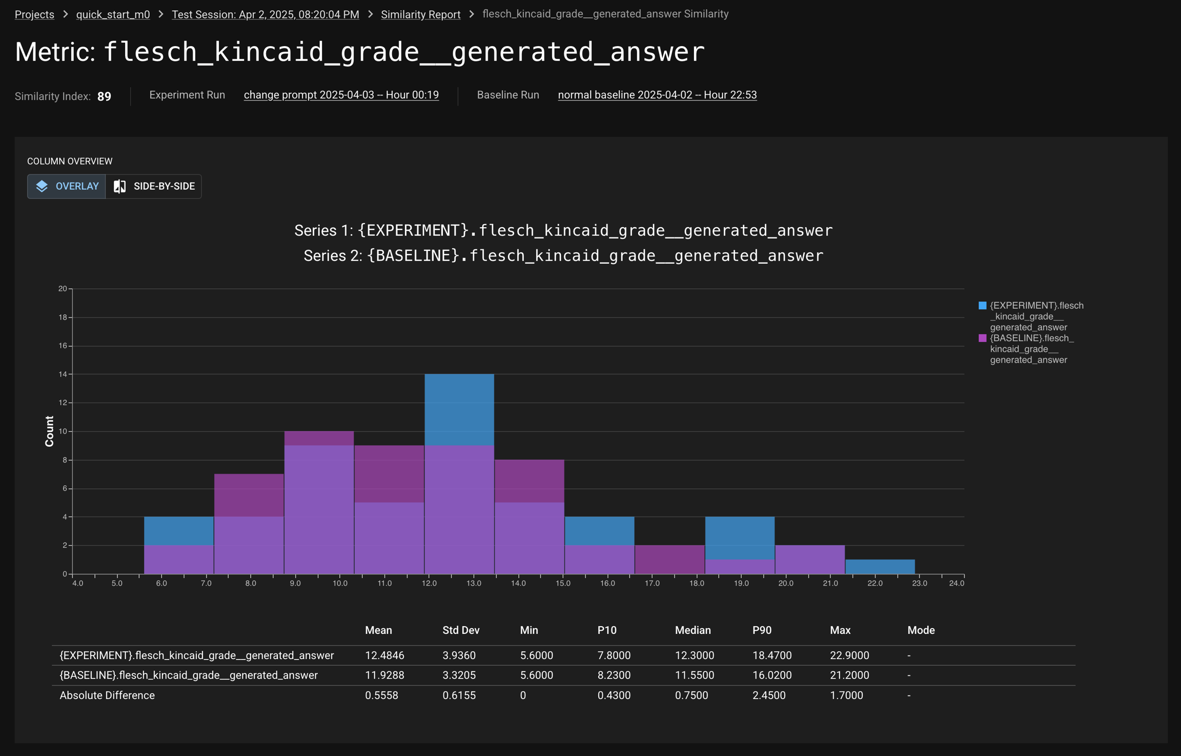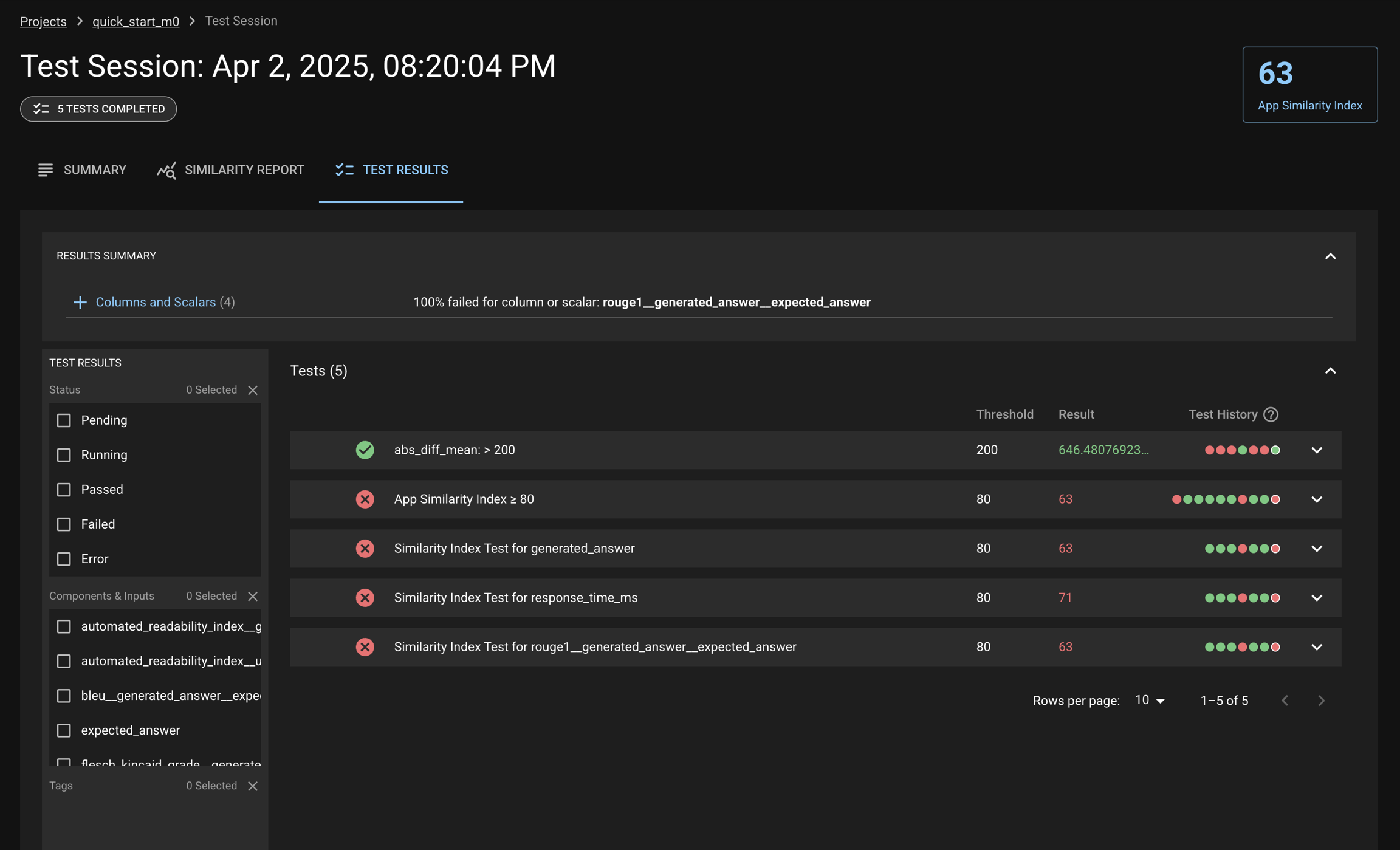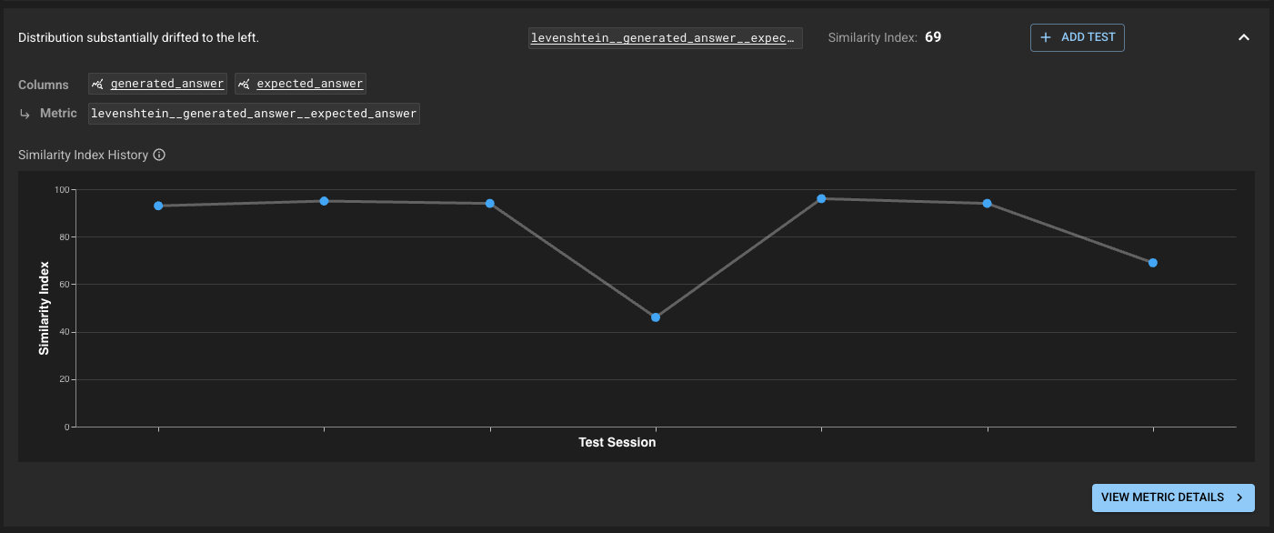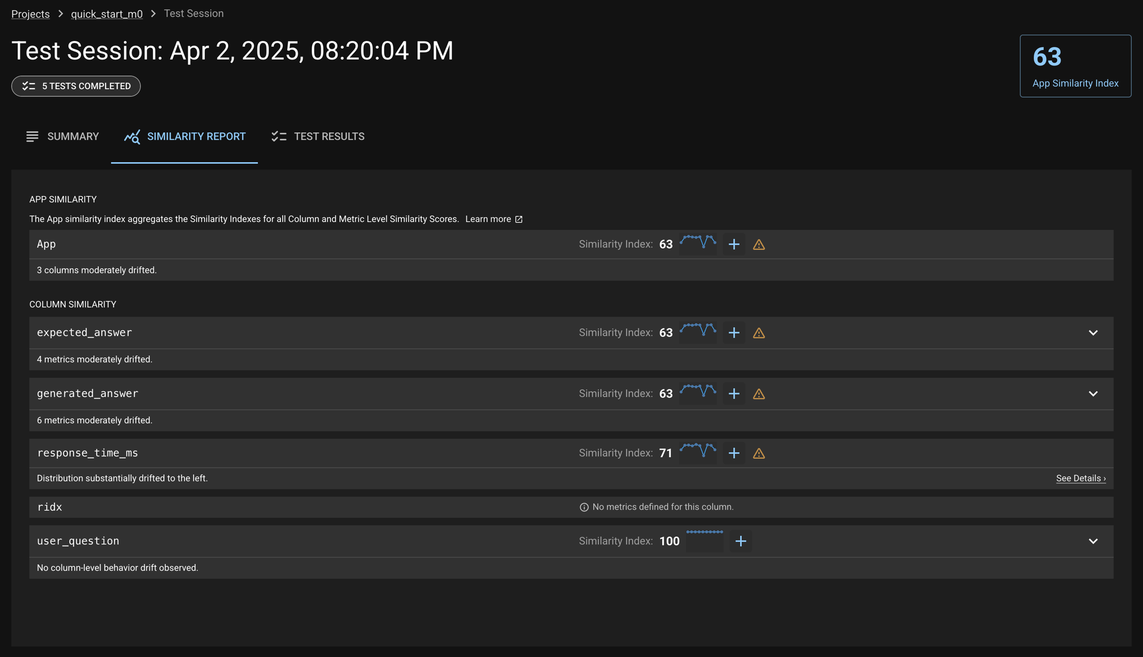 Across the Test Session page, you will see Similarity Indexes at both an "App" level as well as on each of your columns and metrics. This is a special summary score that DBNL calculates for you to help you quickly and easily understand how much your app has changed between the Experiment and Baseline Runs within the session, both holistically and at a granular level. You can define tests on any of the indexes — at the app level or on a specific metric or column. For more information, see the section "What Is a Similarity Index?".