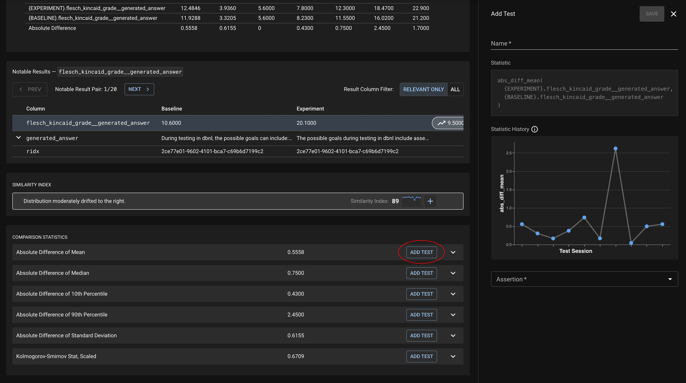 From this view, you can easily compare the changes in the column/metric with graphs and summary statistics. You can hover over a statistic in the table to quickly create a test from it.