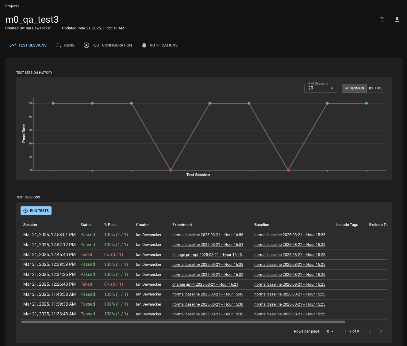 The Test Sessions section in your Project is a record of all the Test Sessions you've created. You can view a line chart of the pass rate of your Test Sessions over time or view a table with each row representing a Test Session You can click on a point in the chart or a row in the table to navigate to the corresponding Test Session's detail page to dig into what happened within that session.