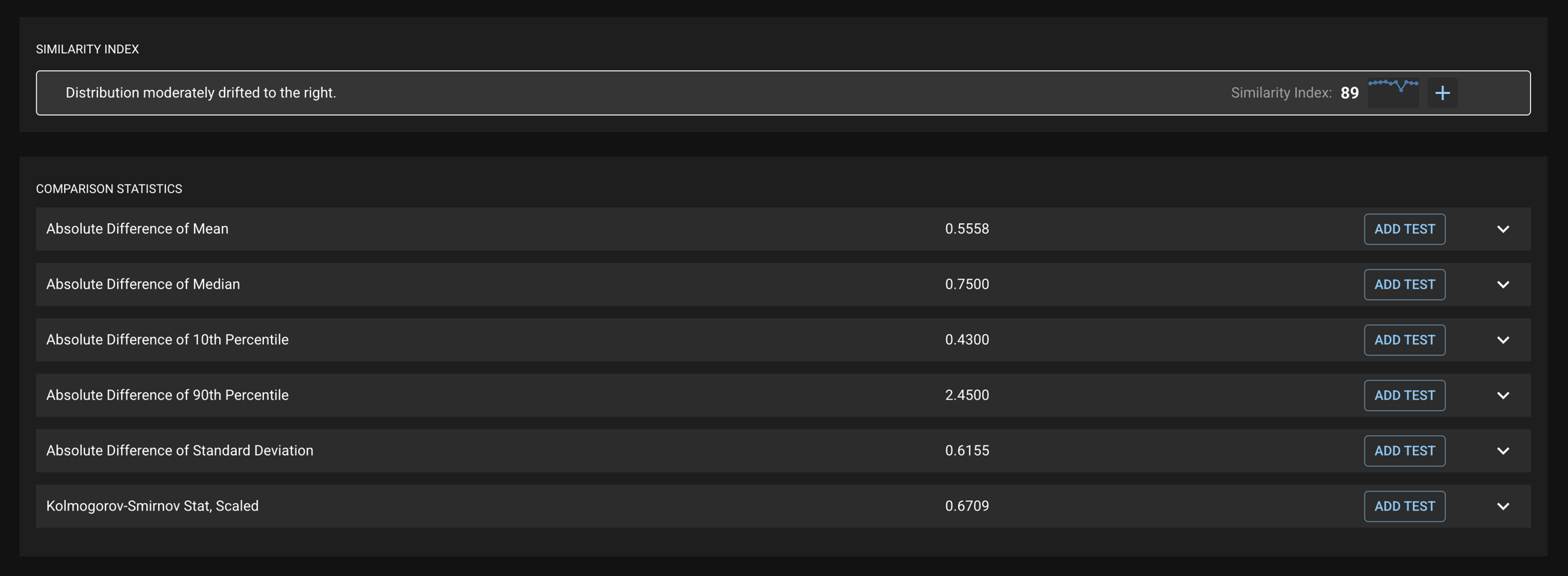 The Similarity Report tab gives you an overview of all the columns your Experiment Run, providing the relevant Similarity Indexes, the ability to quickly create tests from them, and the option to deep-dive into a column. This deep-dive provides you with the tools to understand the Similarity Index value and investigate what has changed about the respective column. Expanding one of the rows for a column for show you all the metrics calculated for that column, with their own respective Similarity Indexes and details.