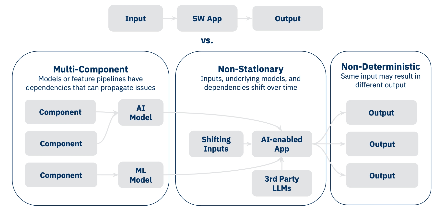 Second, AI applications are non-stationary, meaning their behavior changes over time even if you don't change the code. This happens because the world they interact with changes - new data comes in, language patterns evolve, and third-party models get updated. A test that passes today might fail tomorrow, not because of a bug, but because the underlying conditions have shifted.