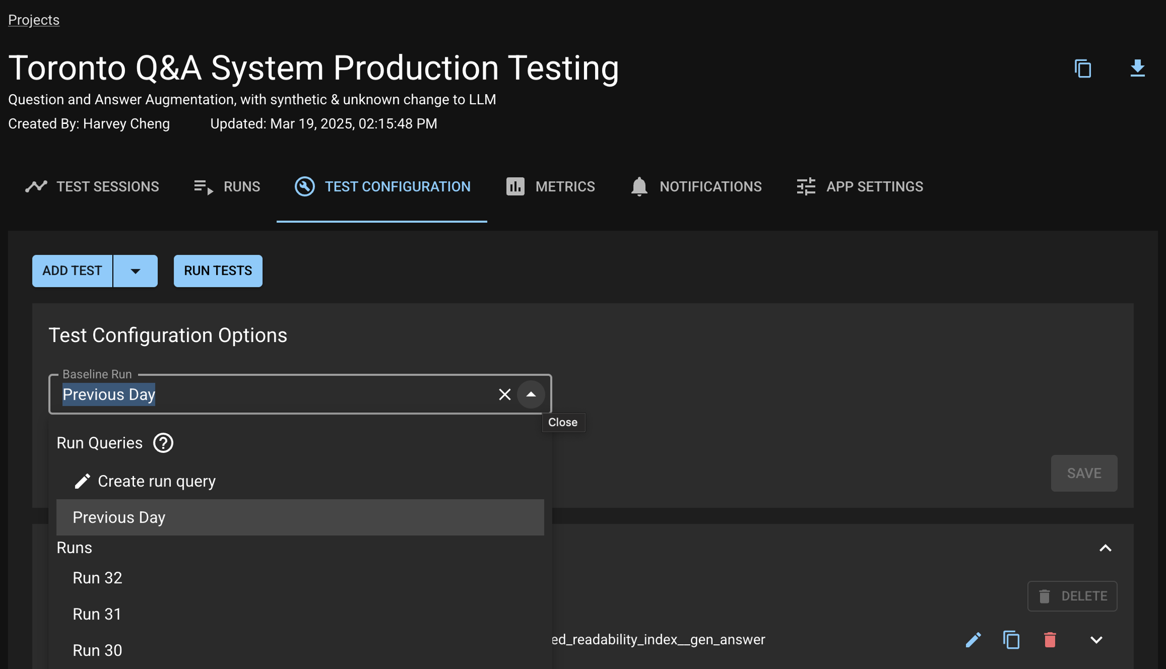 From your Project, click the "Test Configuration" tab. Choose a Run or Run Query from the Baseline Run dropdown.