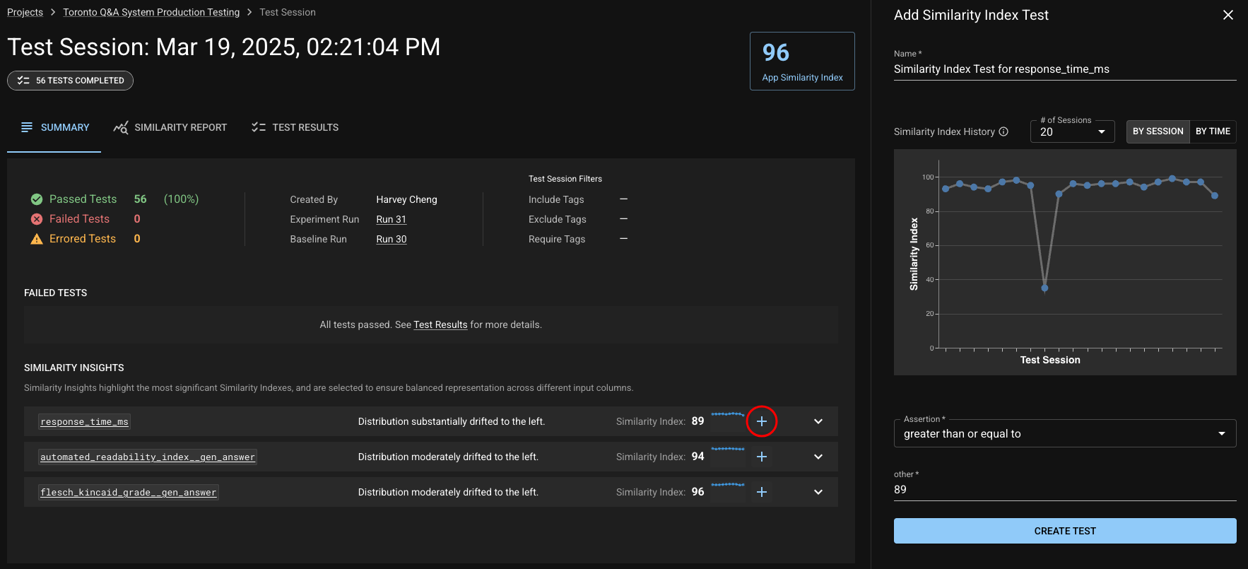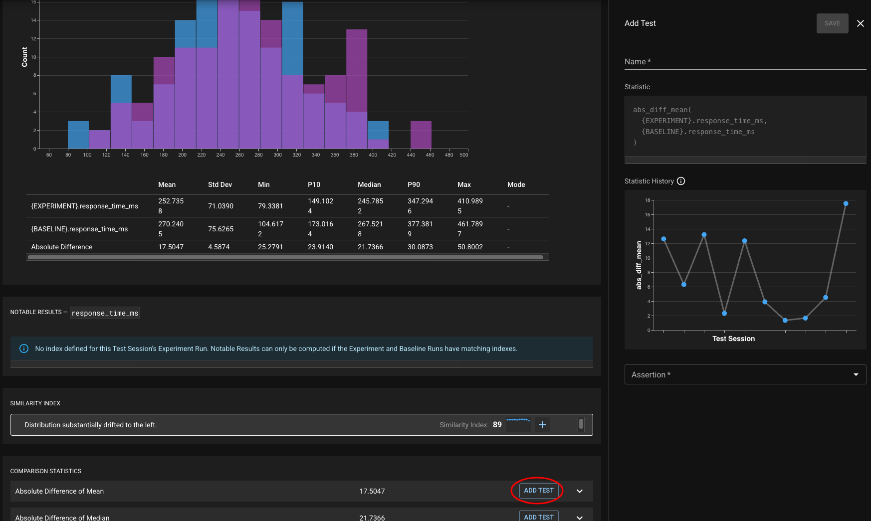 When scrolling through the details of a column or metric from a Test Session (found by drilling into that column or metric from the Similarity Insights or Similarity Report), there are several "Add Test" buttons provided to allow you to quickly create a test on a relevant statistic or Similarity Index. The respective history graphs can help guide you on choosing a threshold.