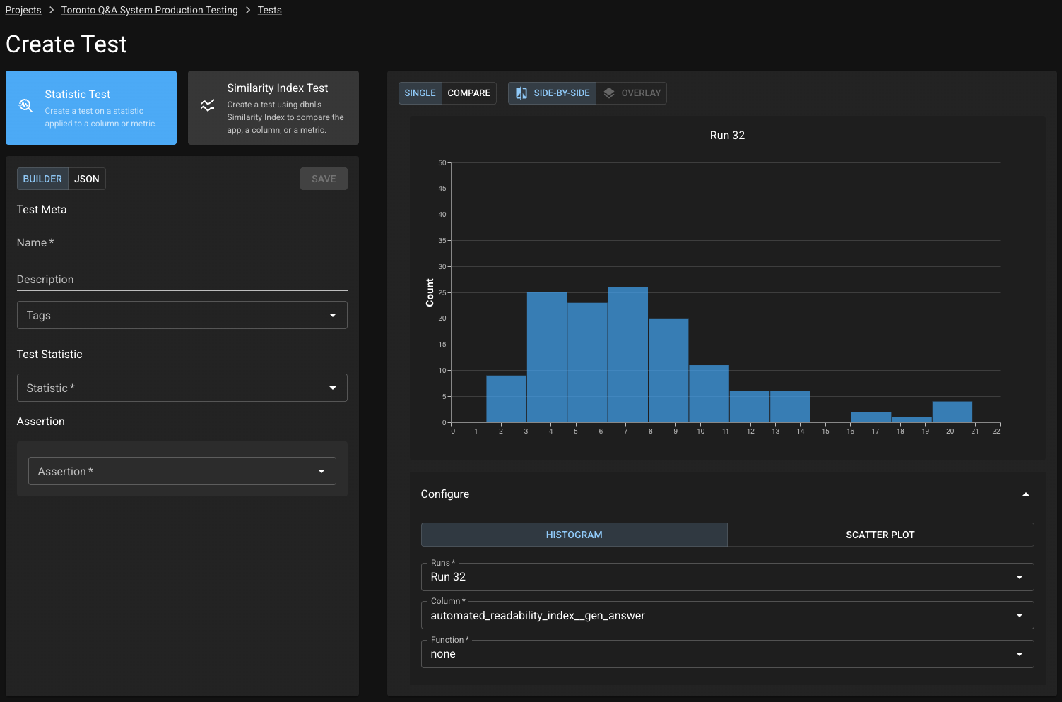 On the left side you can configure your test by choosing a statistic and assertion. Note that you can use our builder or build a test spec with raw JSON (you can see some example test spec JSONs here). On the right, you can browse the data of recent Runs to help you figure out what statistics and thresholds are appropriate to define acceptable behavior.