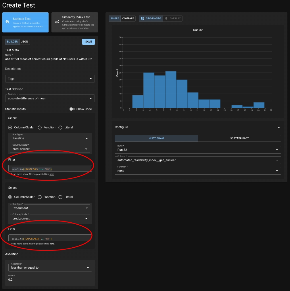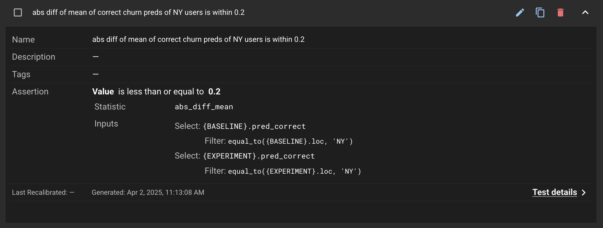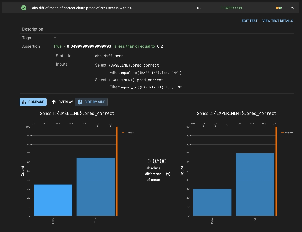For example, you might want to create a test that asserts that the absolute difference of means of the correct churn predictions is <= 0.2 between Baseline and Experiment Runs, only for rows where the loc column is NY.