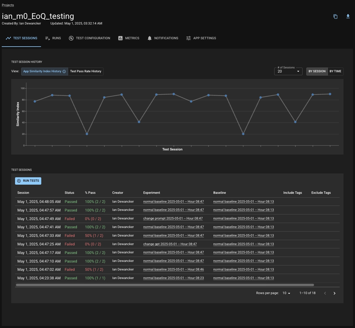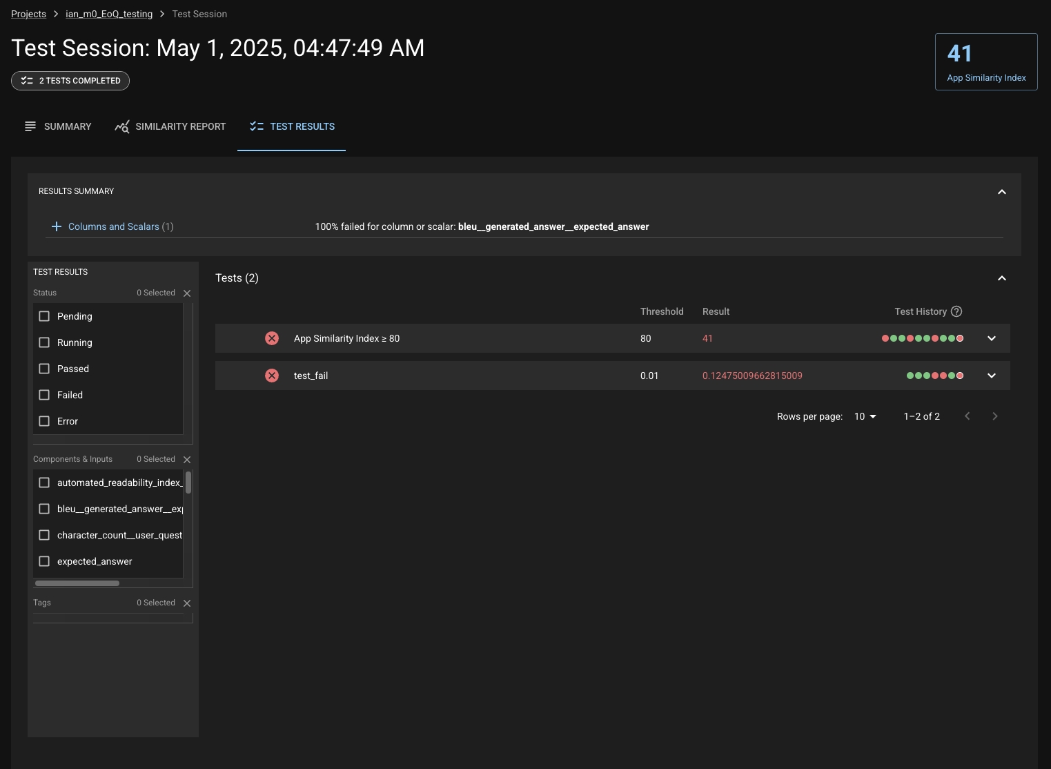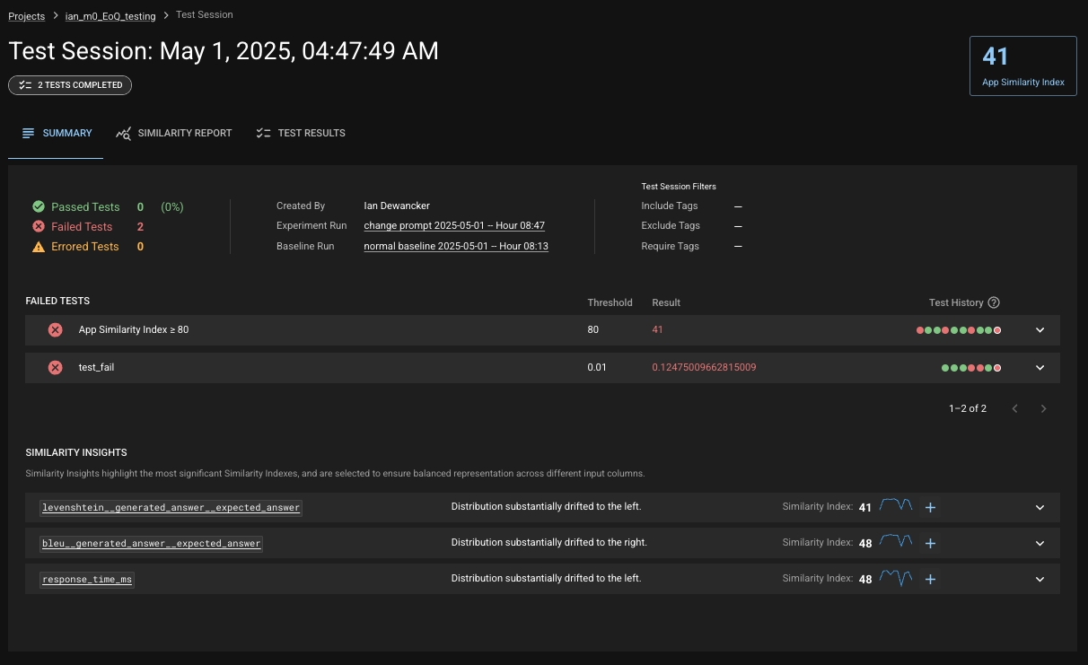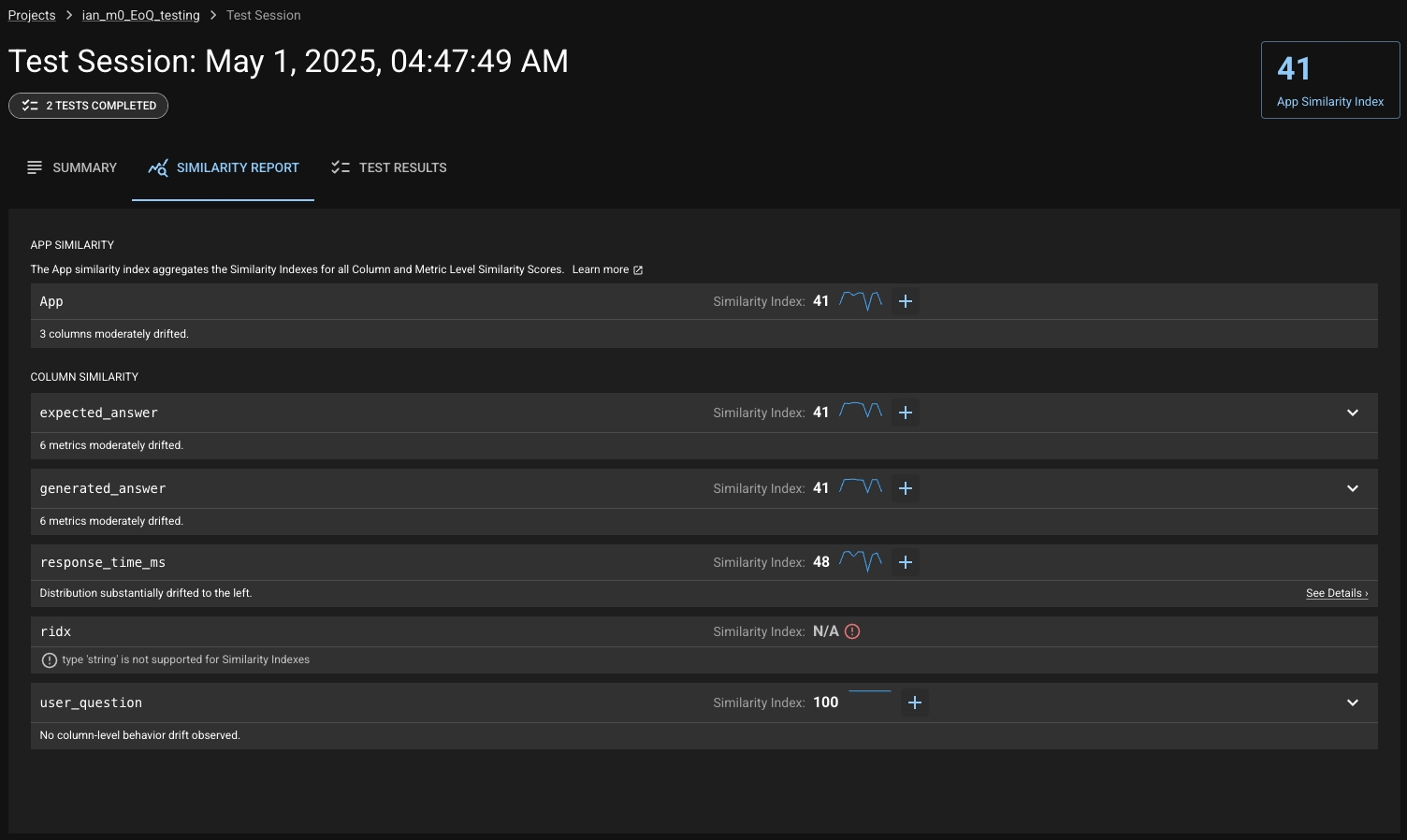 Across the Test Session page, you will see Similarity Indexes at both an "App" level as well as on each of your columns and metrics. This is a special summary score that DBNL calculates for you to help you quickly and easily understand how much your app has changed between the Experiment and Baseline Runs within the session, both holistically and at a granular level. You can define tests on any of the indexes — at the app level or on a specific metric or column. For more information, see the section "What Is a Similarity Index?".