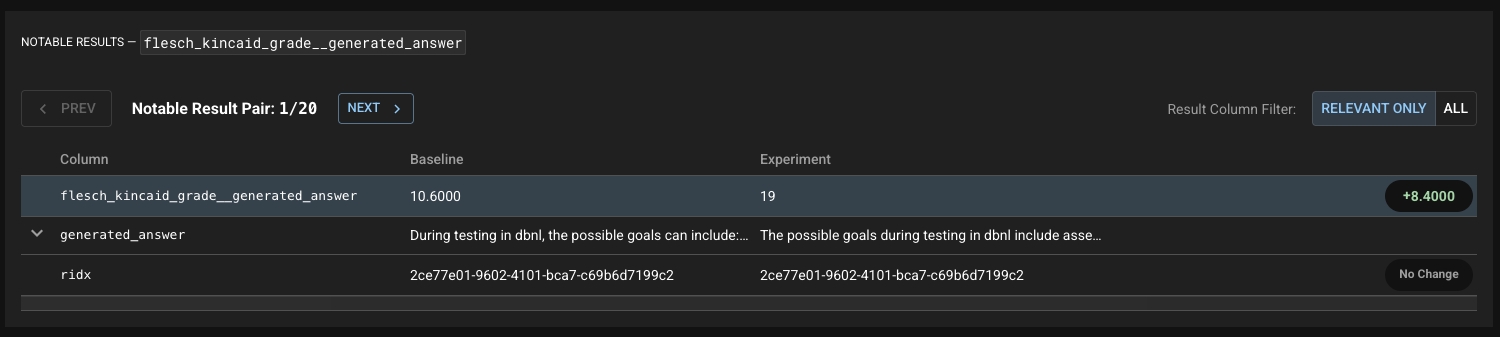 Just below the graph and chart, you'll see a list of "Notable Results". These are paired results from each Run — the Baseline and the Experiment — that DBNL thinks best illustrate the change in the column or metric you're viewing.
