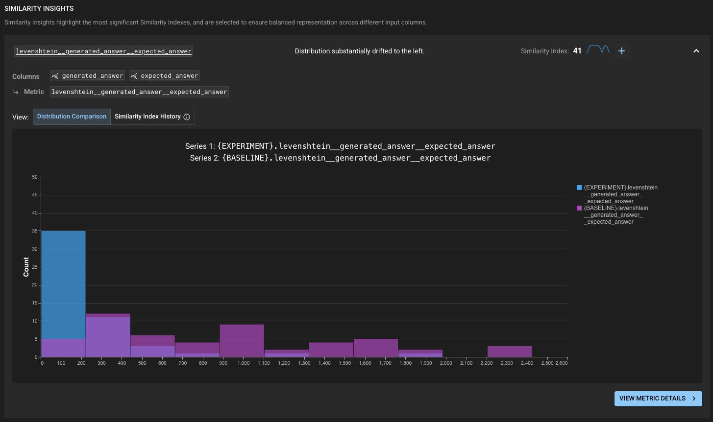The Similarity Report tab gives you an overview of all the columns your Experiment Run, providing the relevant Similarity Indexes, the ability to quickly create tests from them, and the option to deep-dive into a column. This deep-dive provides you with the tools to understand the Similarity Index value and investigate what has changed about the respective column. Expanding one of the rows for a column for show you all the metrics calculated for that column, with their own respective Similarity Indexes and details.