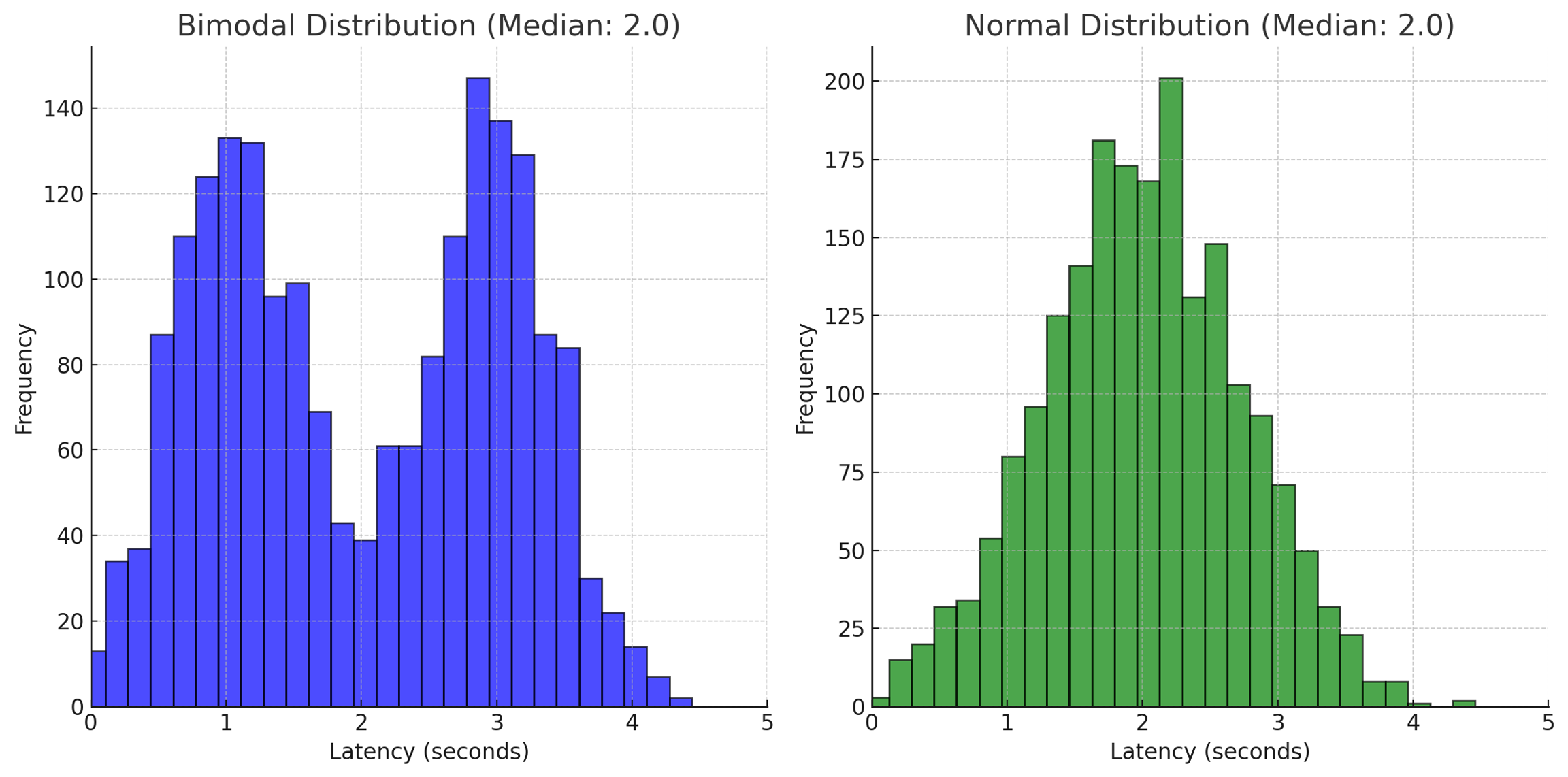 Consider a scenario where the distribution of LLM latency started with a normal distribution, but due to changes in a third-party data API that your app uses to inform the response of the LLM, the latency distribution becomes bimodal, though with the same median (and P90 values) as before. What could cause this? Here’s a practical example of how something like this could happen. The engineering team of the data API organization made an optimization to their API which allows them to return faster responses for a specific subset of high value queries, and routes the remainder of the API calls to a different server which has a slower response rate.