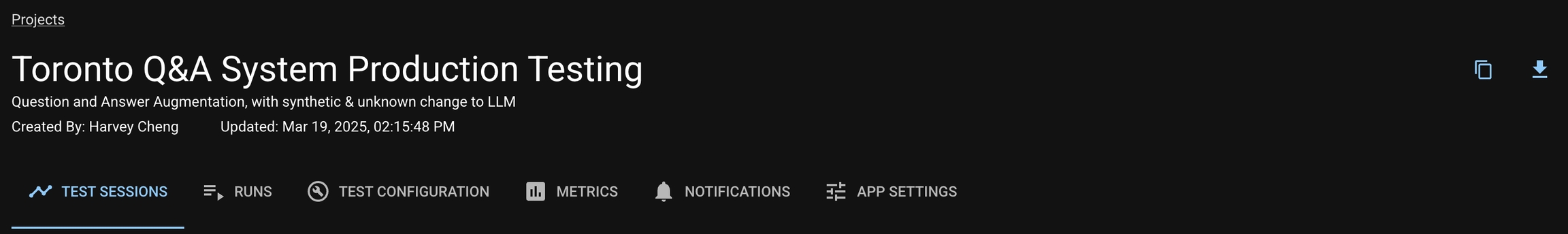 Your Project will contain all of your app's Runs — a collection of results from your app — and all of the tests that you've defined to monitor the behavior of your app. It also has a name and various configurable properties like a default Baseline Run and Notifications.