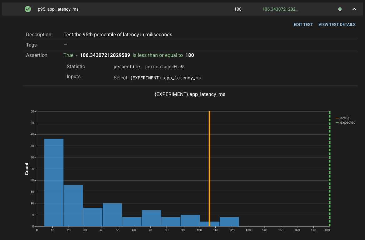 At a high level, a Test is a statistic and an assertion. Generally, the statistic aggregates the data in a column or columns, and the assertion tests some truth about that aggregation. This assertion may check the values from a single Run, or it may check how the values in a Run have changed compared to a baseline. Some basic examples: