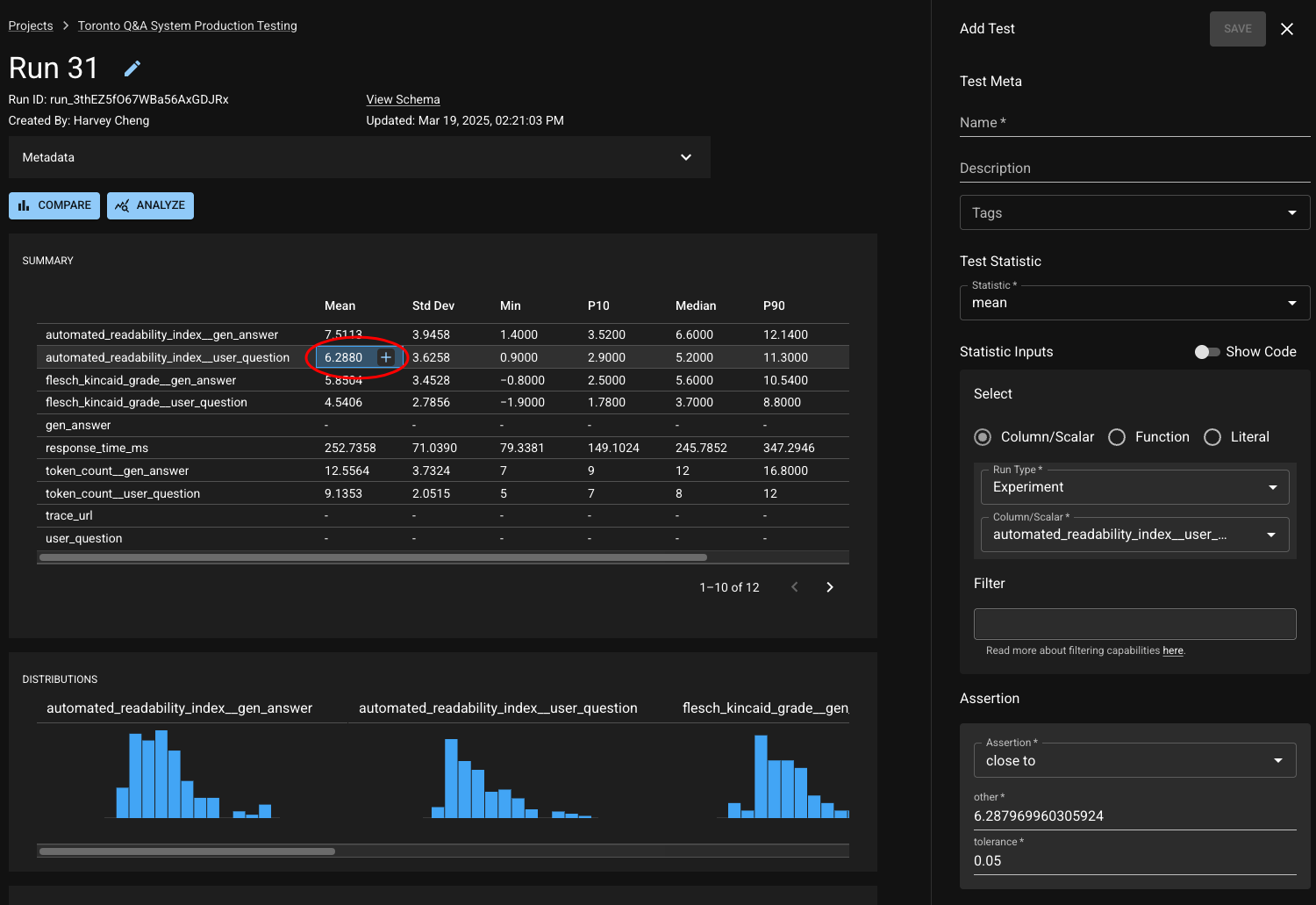 When viewing a Run, each entry in the summary statistics table can be used to seed creation of a test for that chosen statistic.