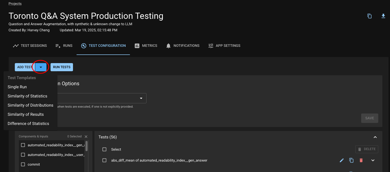 At the top, you can click "Add Test" to open the test creation page, which will enable you to define your test through the dropdown menu on the left side of the window.