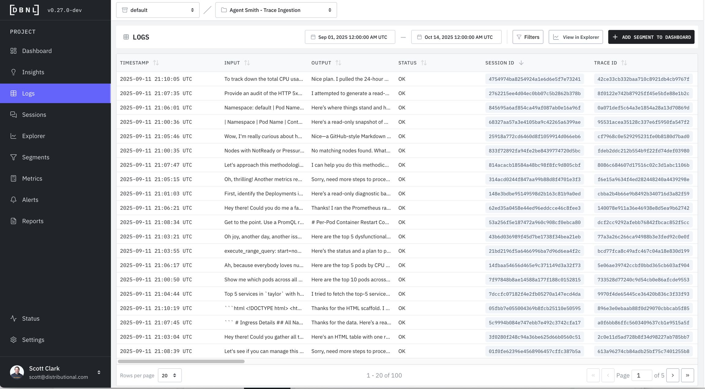 session_idprovided): All associated logs for the given session, along with Metrics.