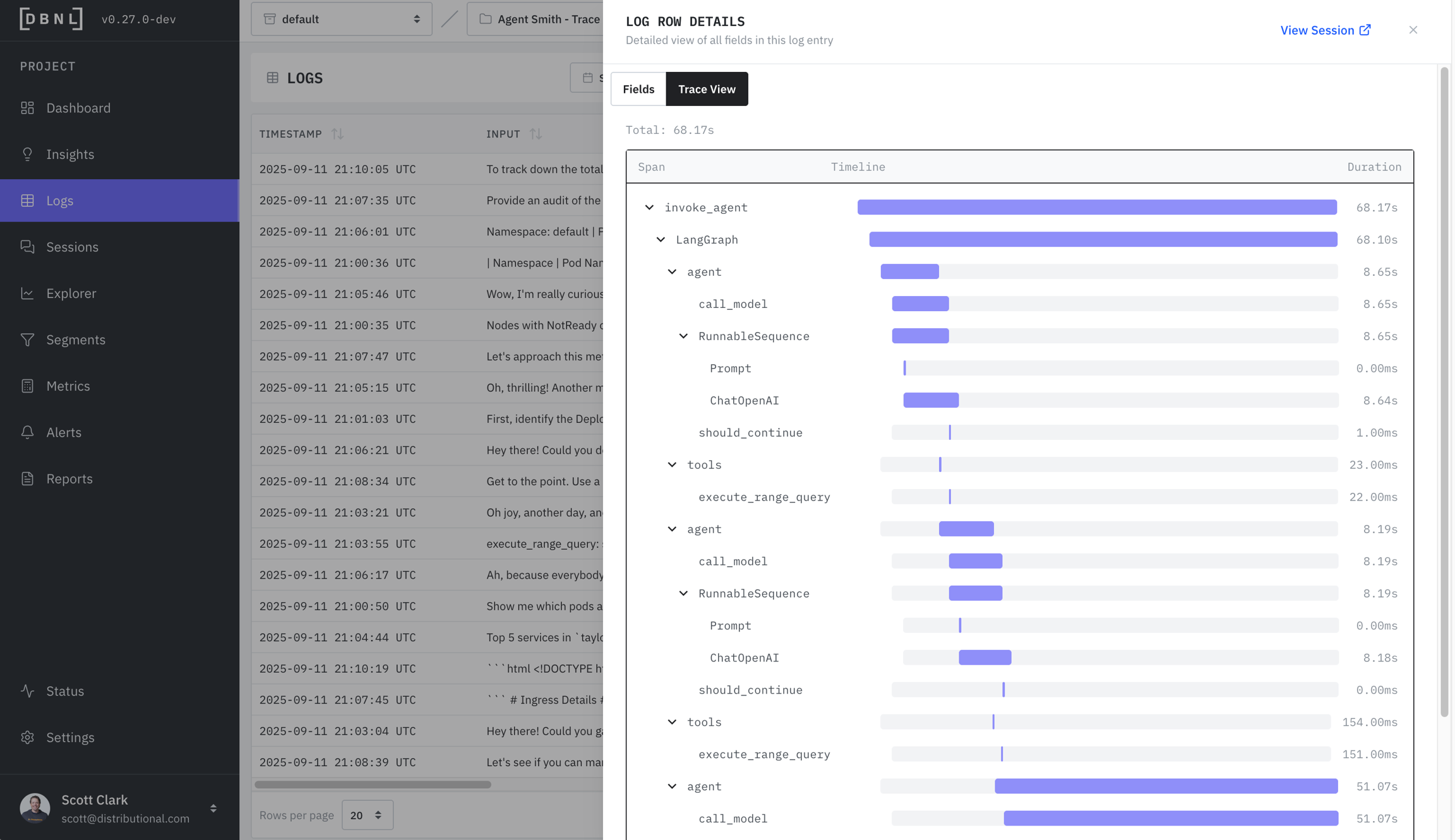The waterfall trace view of latency and timing for each individual span. Only available if spans was provided as part of the DBNL Semantic Convention.
