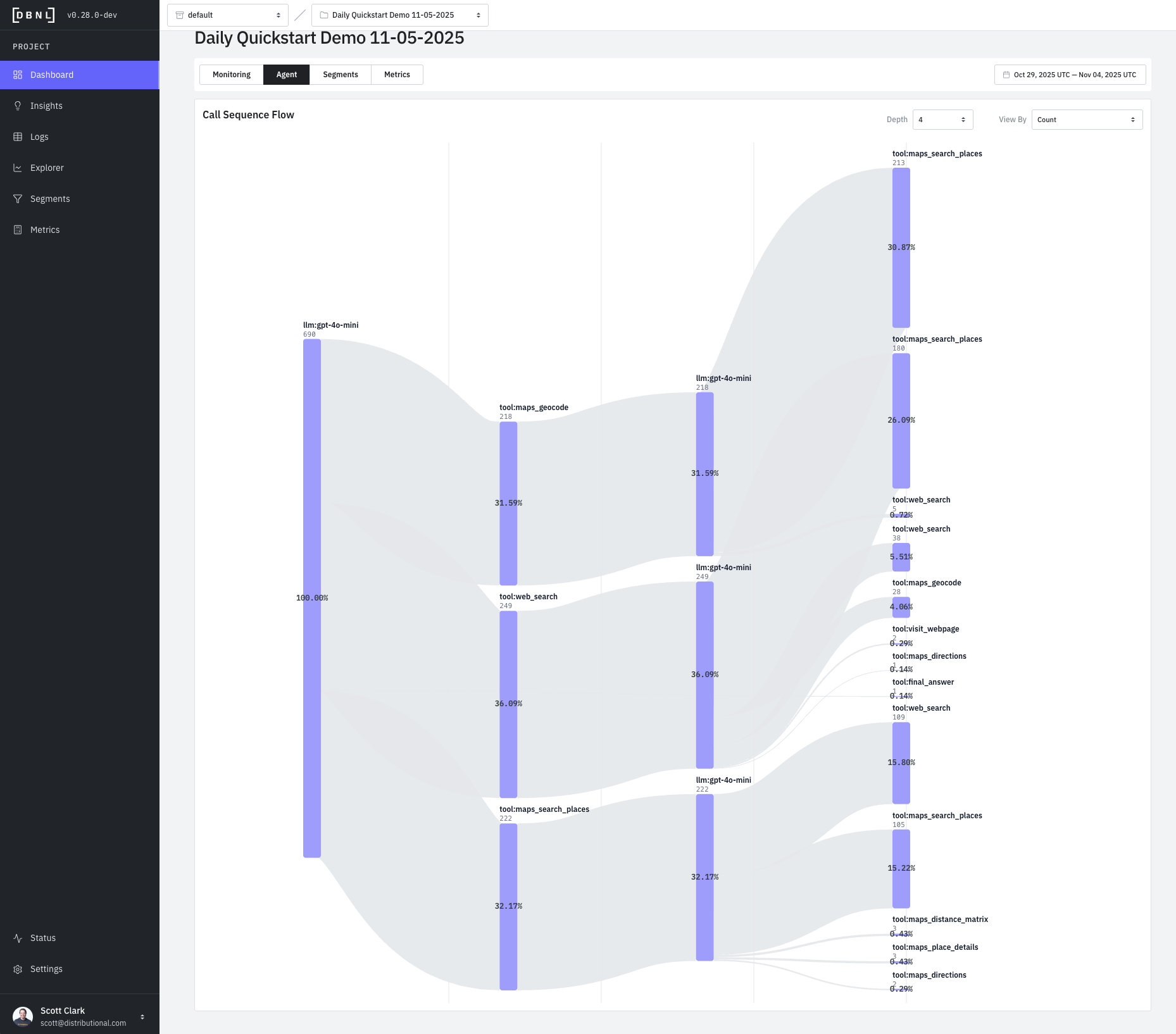 Agent Dashboard: Directed graph of all agent tool calls as a Sankey chart to allow for rapid exploration of tool call chains.