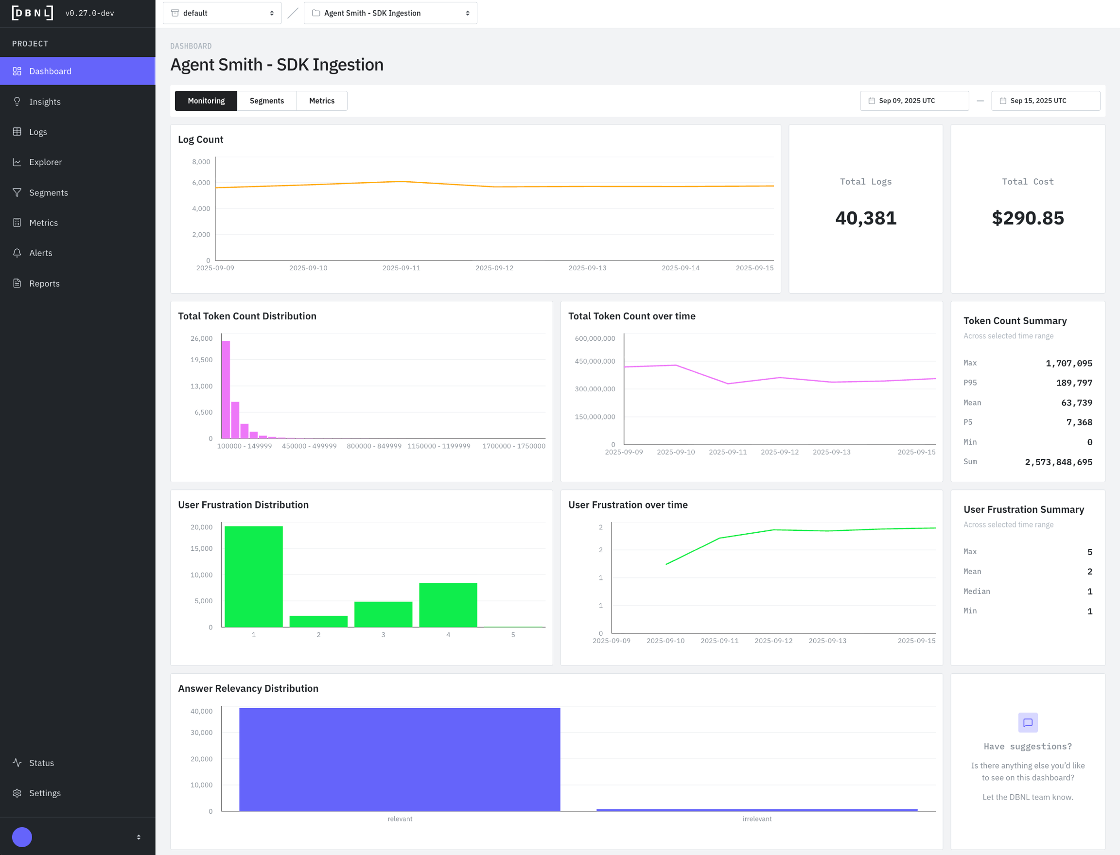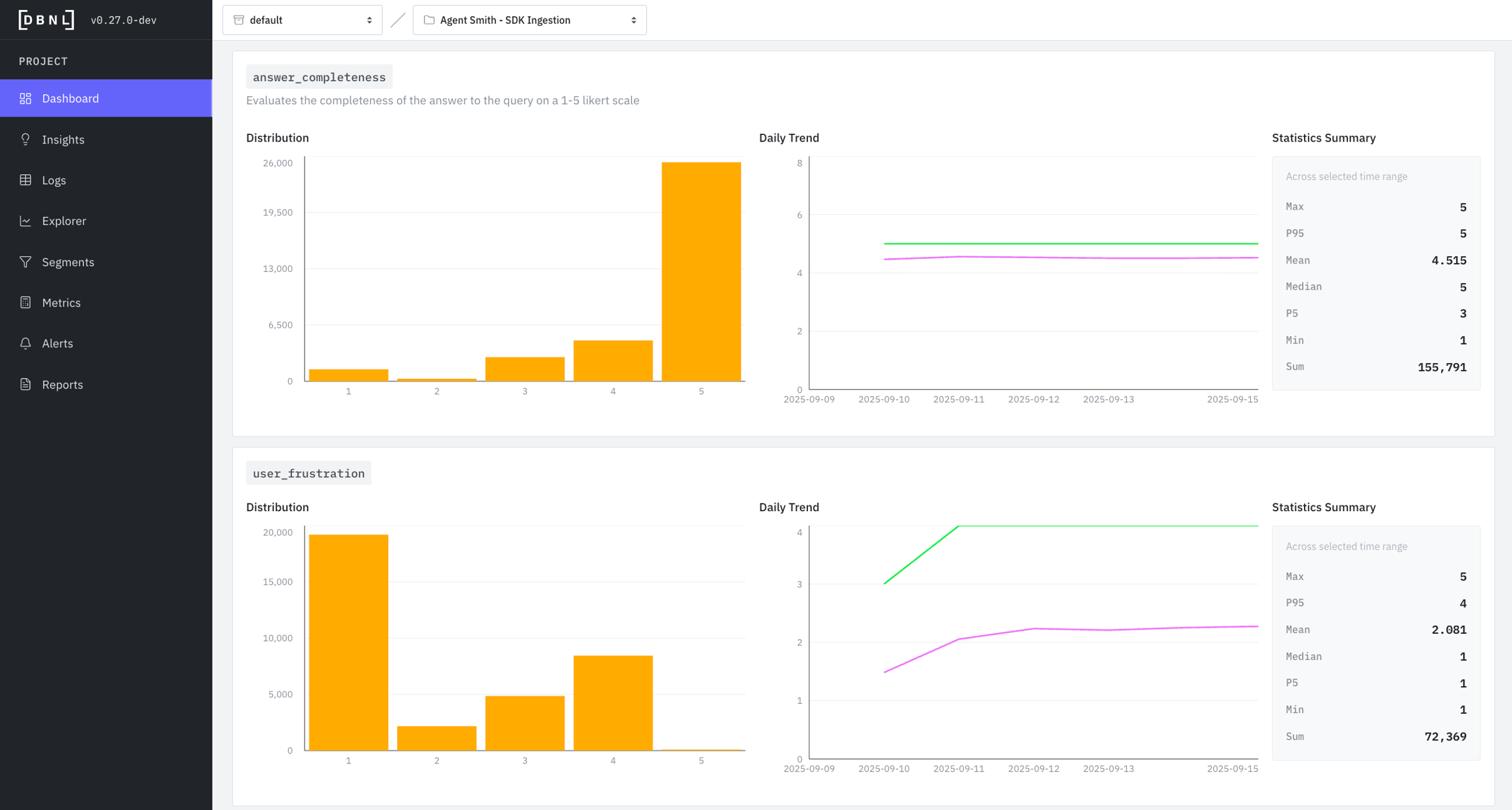 Monitoring Dashboard: Distributional recommended graphs and statistics built from required Columns and data from the DBNL Semantic Convention